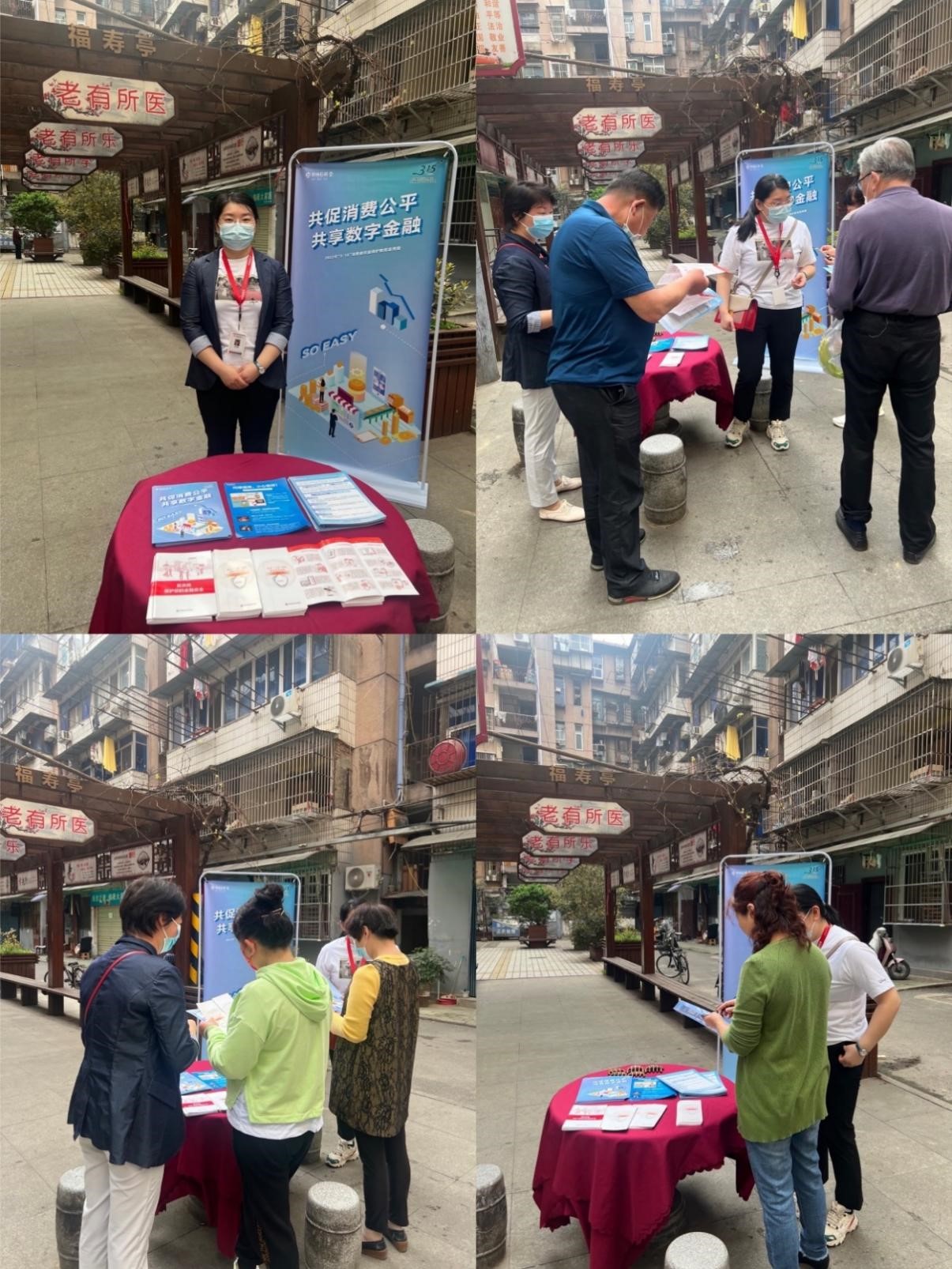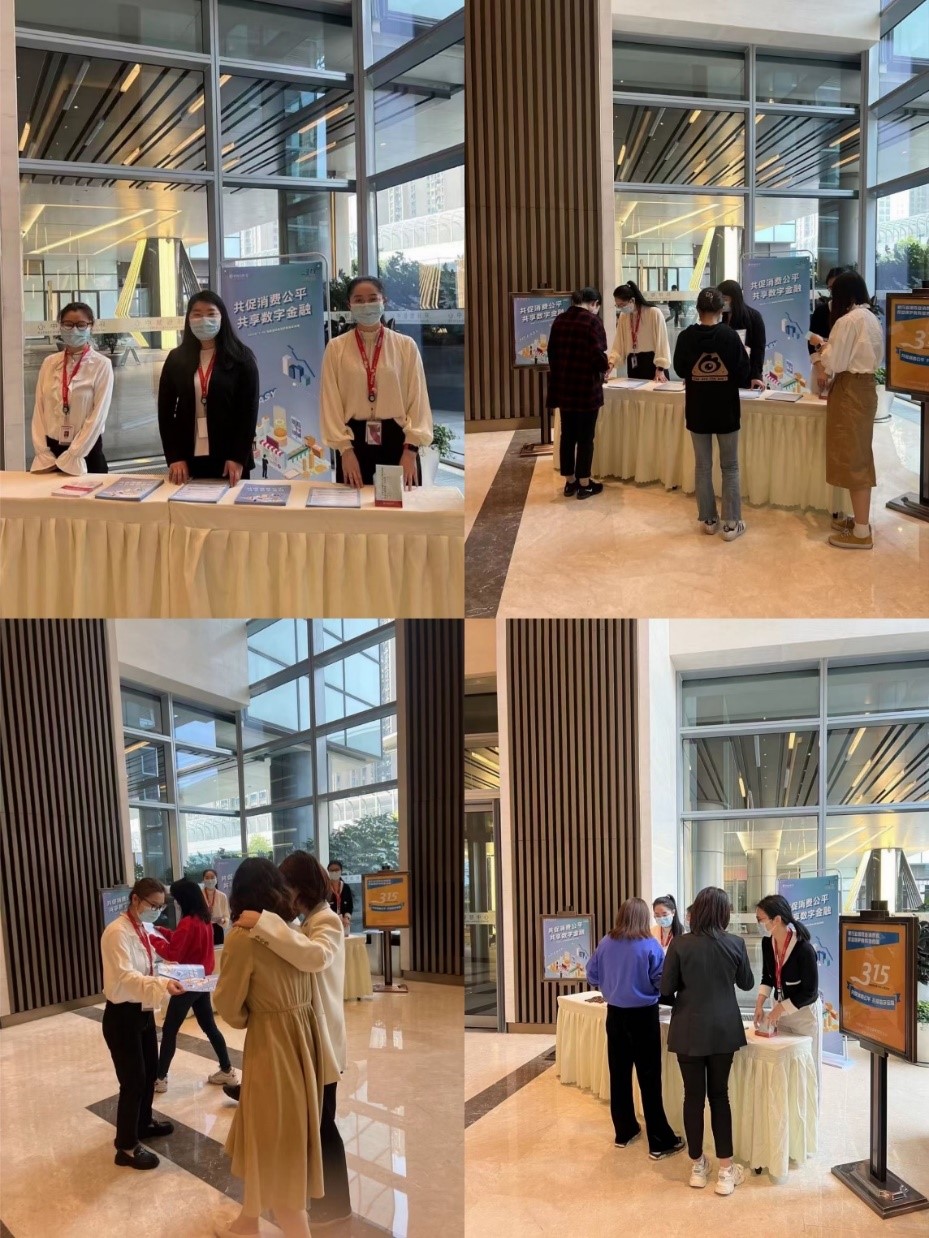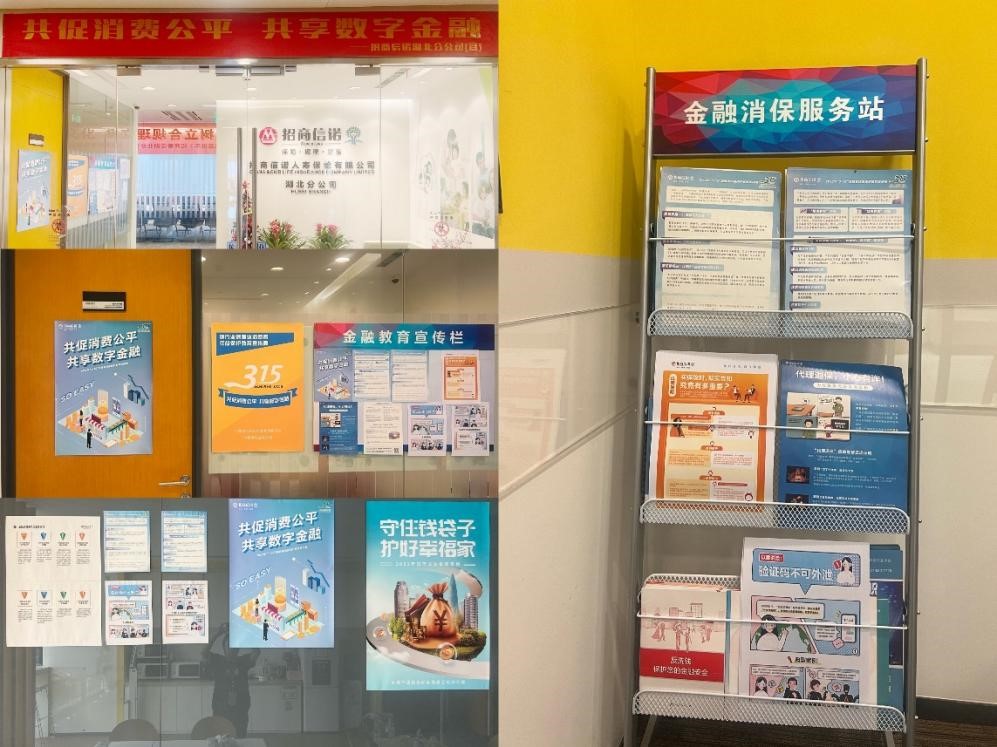本次活动口号“共促消费公平 共享数字金融”横幅悬挂于湖北分公司正门门头;活动海报及相关宣传资料张贴于金融教育宣传栏、金融消保服务站及公司醒目位置;湖北分公司客户接待室滚动播放“共促消费公平 共享数字金融”图片,营造良好的宣教氛围,对到访的每一位客户进行一对一消费者权益保护宣传教育。