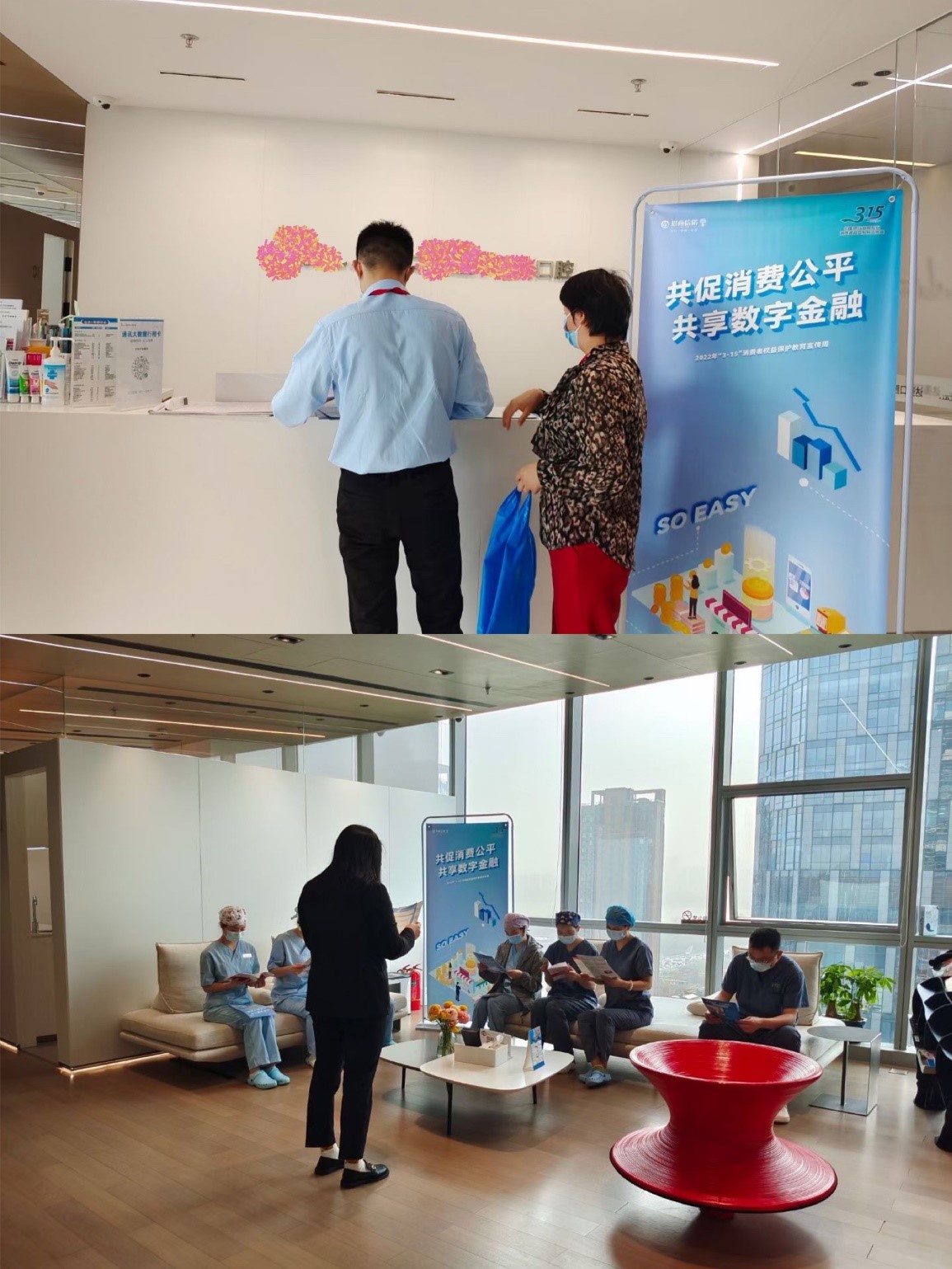 3月15日,湖北分公司与某口腔机构联手,在医院摆放宣传展架、折页等,通过对来访客户发放折页及疑问解答等形式普及相关消费者权益保护相关知识;同时,利用员工早会时间对员工进行“集训”式知识普及。