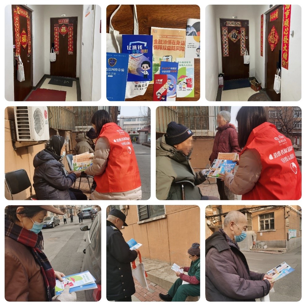 “3.15金融消费者权益保护教育宣传活动”期间,招商信诺辽宁分公司金融公益宣传队开展以“金融消保在身边 保障权益防风险”为主题的系列宣教活动,宣教过程中员工们发现受众群体以小区内身体健康的老年人居多,年轻人及体弱的老年人较少,为了扩大宣传范围,宣传小队的员工们将金融宣传折页放在手提袋中,挂在每位小区住户门的把手上,以“扫楼”的方式为无法参加宣传活动的上班族准备一份金融宣传套餐。在小区“扫楼”的过程中也会针对年龄较大,活动不便的老年人进行宣传,员工们放慢交流的语速,以聊天的方式简单明了的语言提示老人们防范金融风险,了解识骗、防骗的技巧,维护个人合法权益。