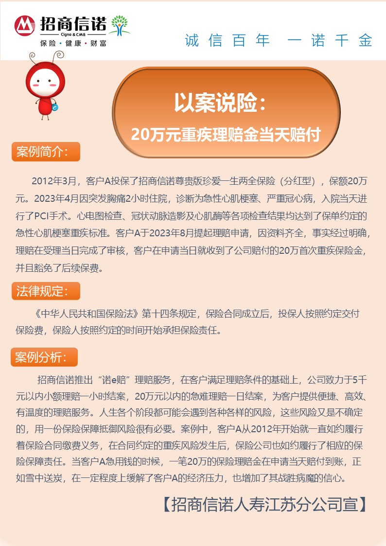 【以案说险】20万元重疾理赔金当天赔付