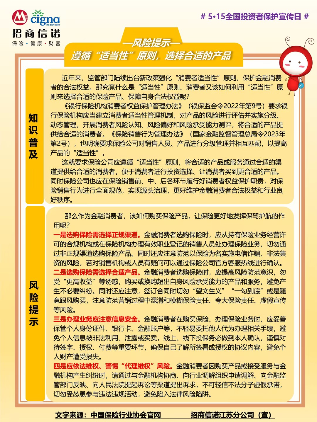 #5·15全国投资者保护宣传日#【风险提示】遵循“适当性”原则,选择合适的产品——招商信诺江苏分公司宣