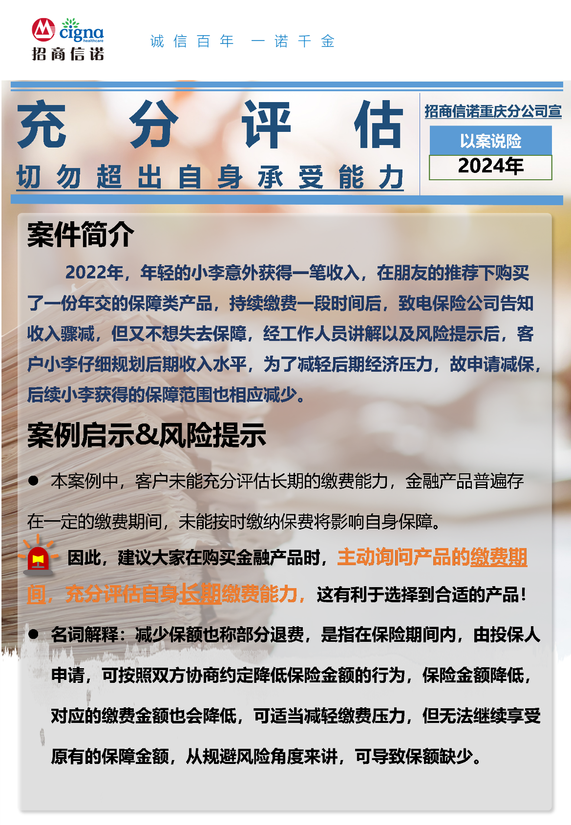 【以案说险】招商信诺重庆分公司提醒您:主动询问金融产品缴费期间,充分评估自身长期缴费能力!