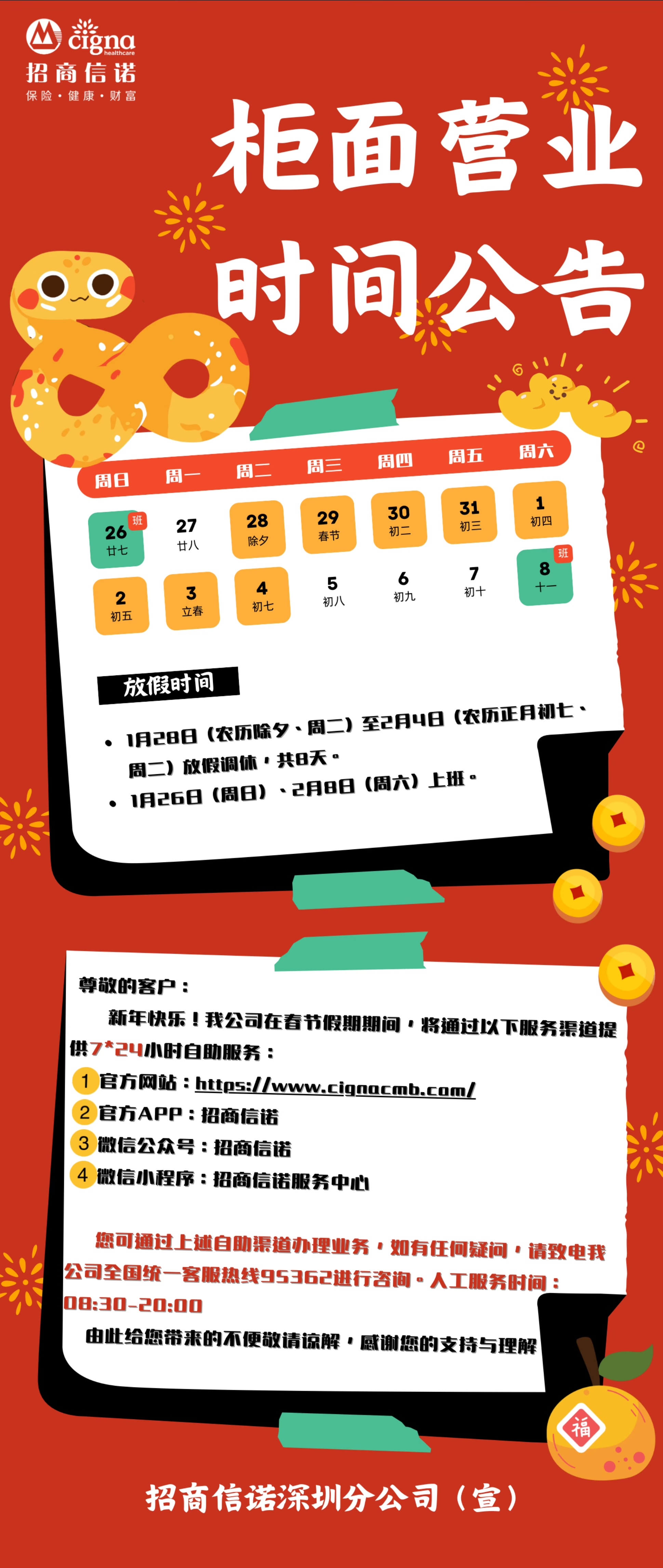 温馨提示:招商信诺深圳分公司春节假期柜面营业时间公告