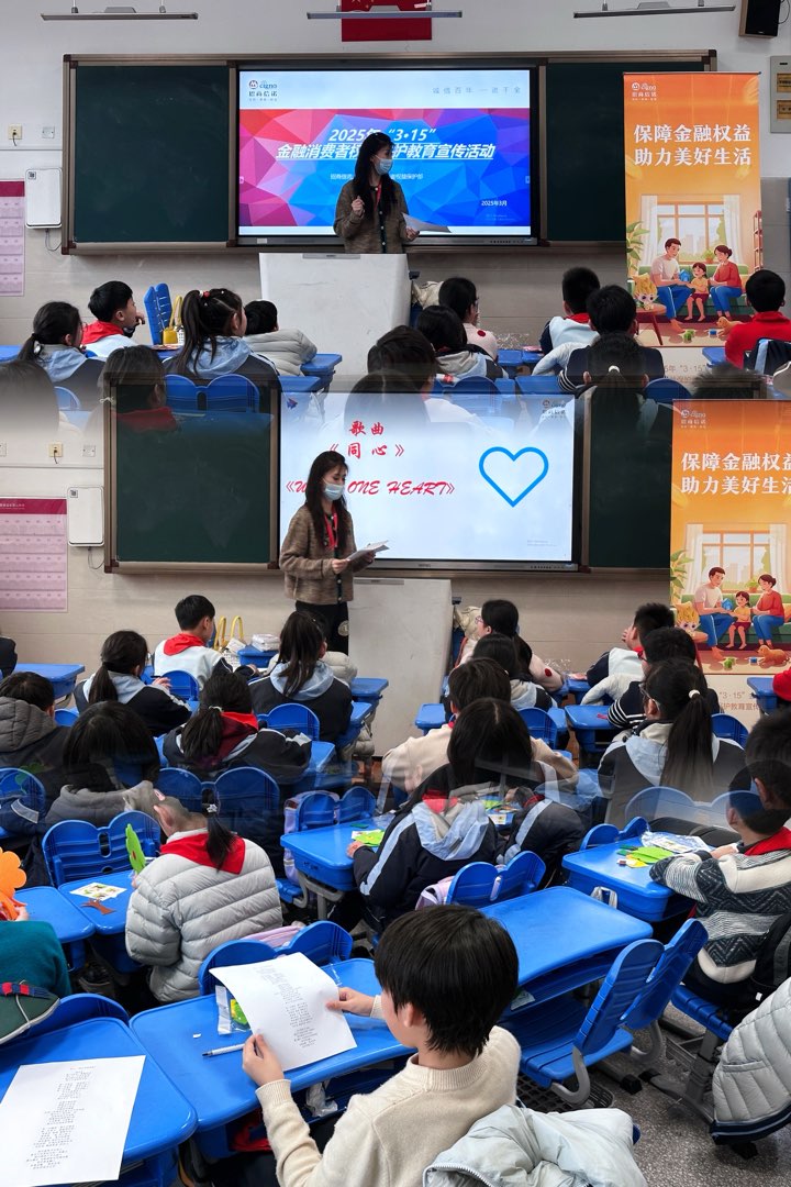 金融宣教活动中,通过宣传金融消费者的基本权益、金融诈骗类型及防范措施等多个方面。通过生动形象的案例、通俗易懂的语言以及多样化的宣教形式,使得学生们能够理解并掌握这些金融知识。过程中,伴随着《同心》歌曲的播放,孩子们还完整朗读现代诗朗诵《用心》。