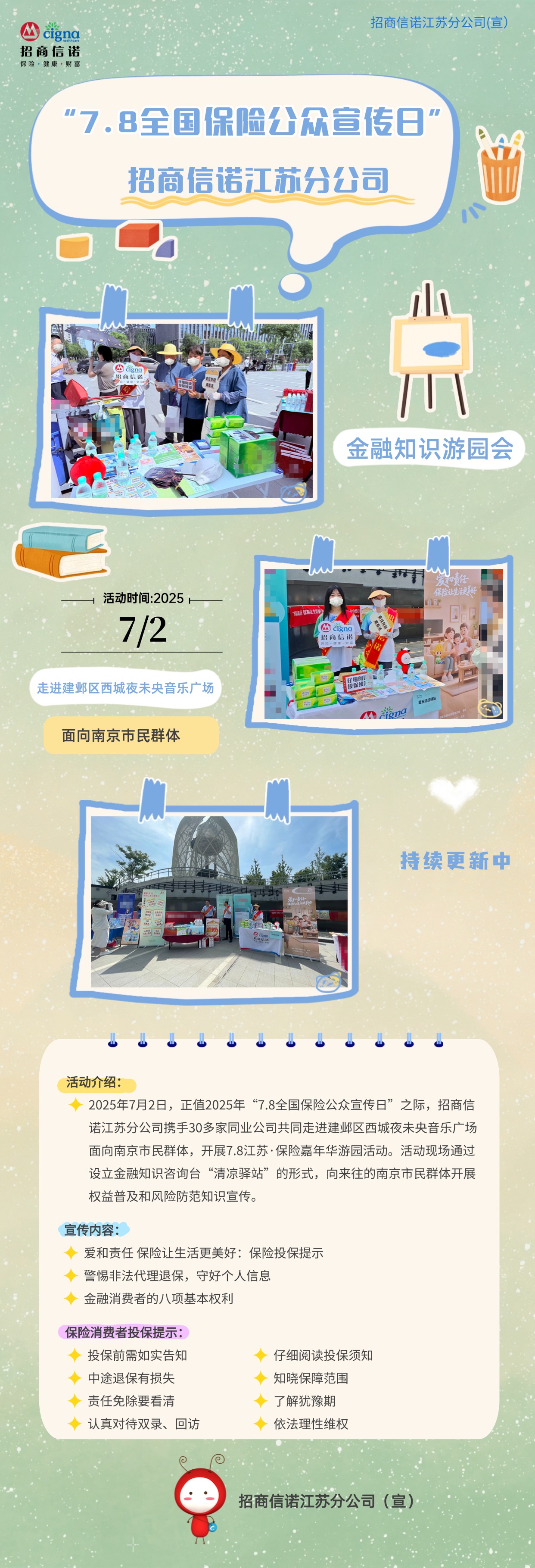 招商信诺江苏分公司携手多家同业公司走进夜未央音乐广场联合开展7.8江苏·保险嘉年华游园活动