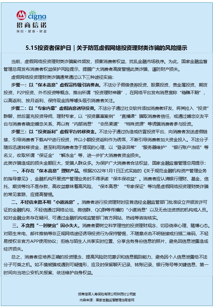 5.15投资者保护日|关于防范虚假网络投资理财类诈骗的风险提示-招商信诺陕西分公司宣