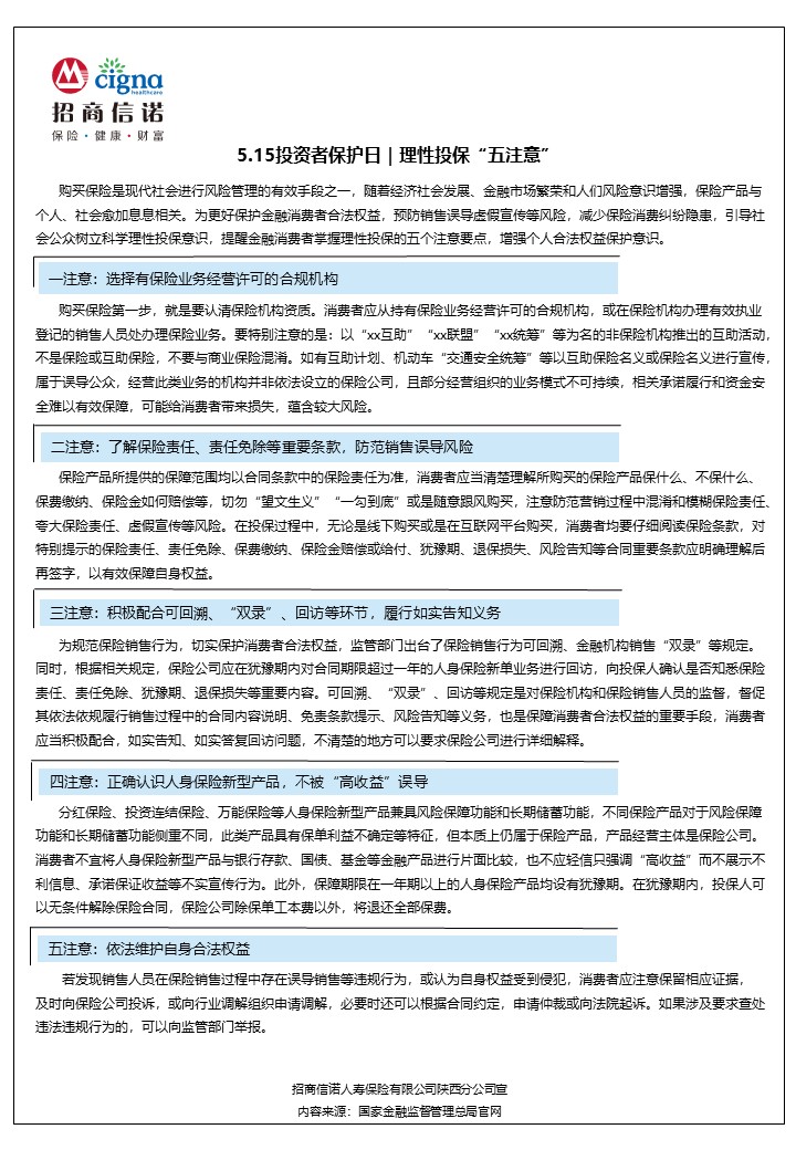 5.15投资者保护日|理性投保“五注意”-招商信诺陕西分公司宣