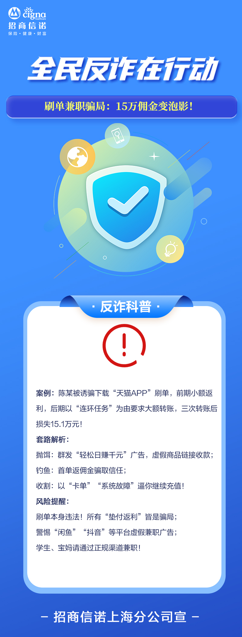 【全民反诈在行动】【风险提示】刷单兼职骗局:15万佣金变泡影——招商信诺上海分公司(宣)