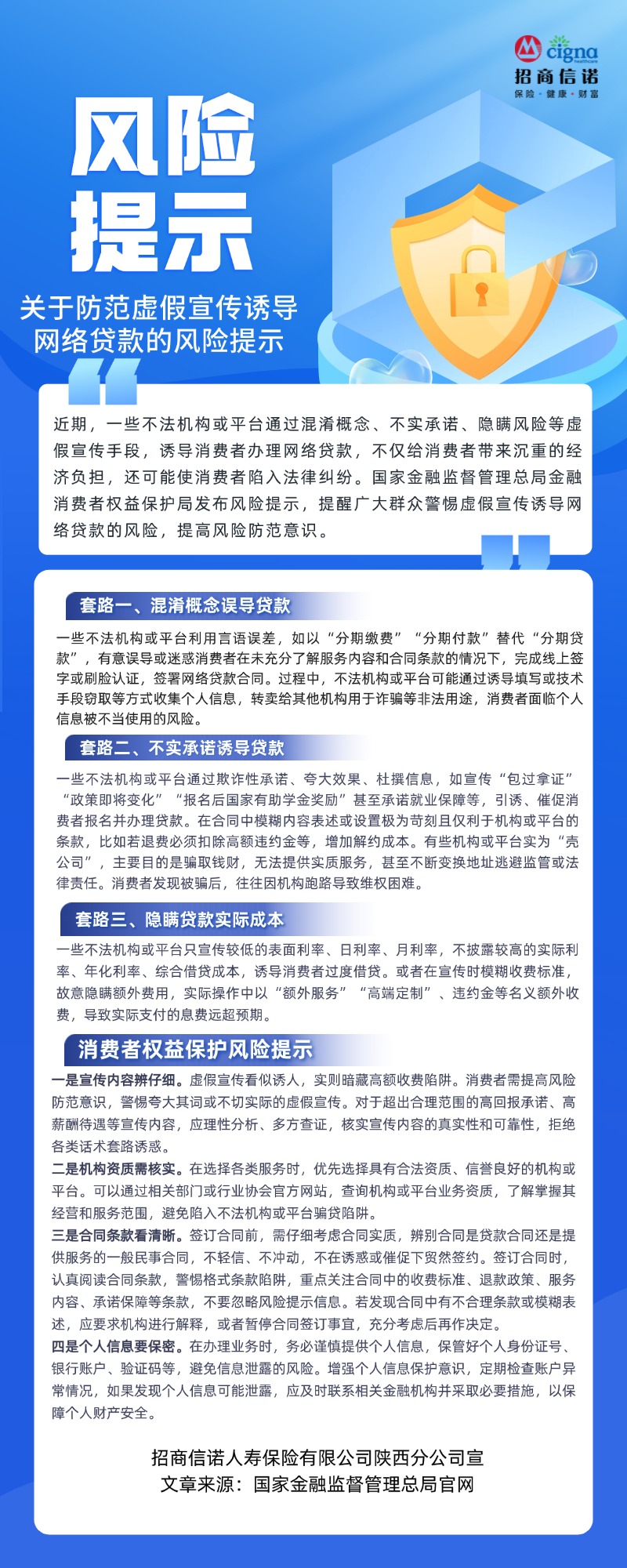 【风险提示】关于防范虚假宣传诱导网络贷款的风险提示——招商信诺陕西分公司宣