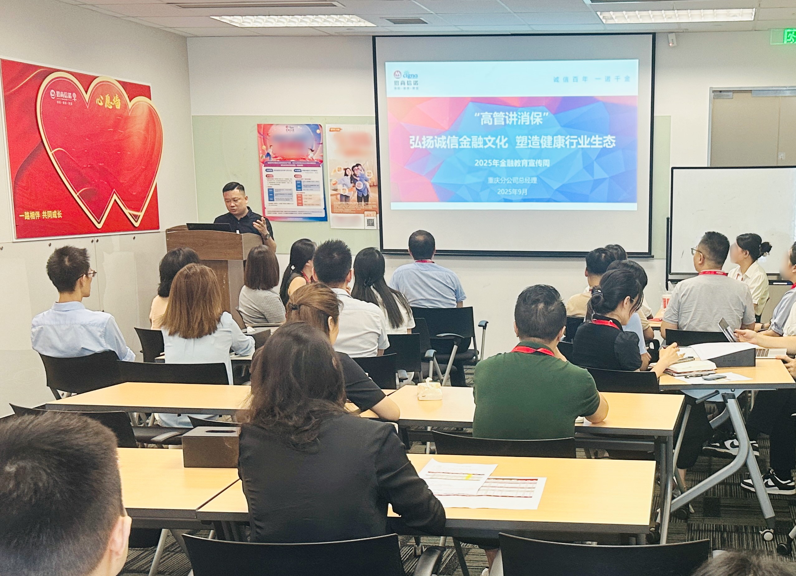 招商信诺重庆分公司总经理曾应州总在此次金融教育宣传周启动当天,率先垂范,以“诚信文化”为核心开展专题授课,深入阐释消费者权益保护工作的战略意义与实践路径,对我公司全体工作人员强调,每个岗位都需要深入领会、充分认识中国特色金融文化,严格履行公司规则制度,以客为尊。通过高层带头宣讲,将消保理念融入公司治理与文化建设,强化全员消保意识,推动构建“以人民为中心”的金融服务生态。活动不仅提升了公司内部消保履职能力,更通过诚信文化的深度传递,为构建健康、透明、负责任的金融生态环境注入持续动力。