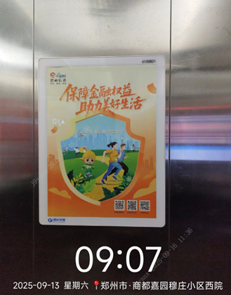 郑东新区作为郑州金融聚集区及人口密集居住区,此次活动覆盖的15个小区涵盖了不同年龄层与职业背景的受众,包括上班族、老年人及新市民群体。126部电梯广告的高频曝光,确保了宣传内容的持续触达,进一步强化了居民的风险防范意识和科学储蓄观念。