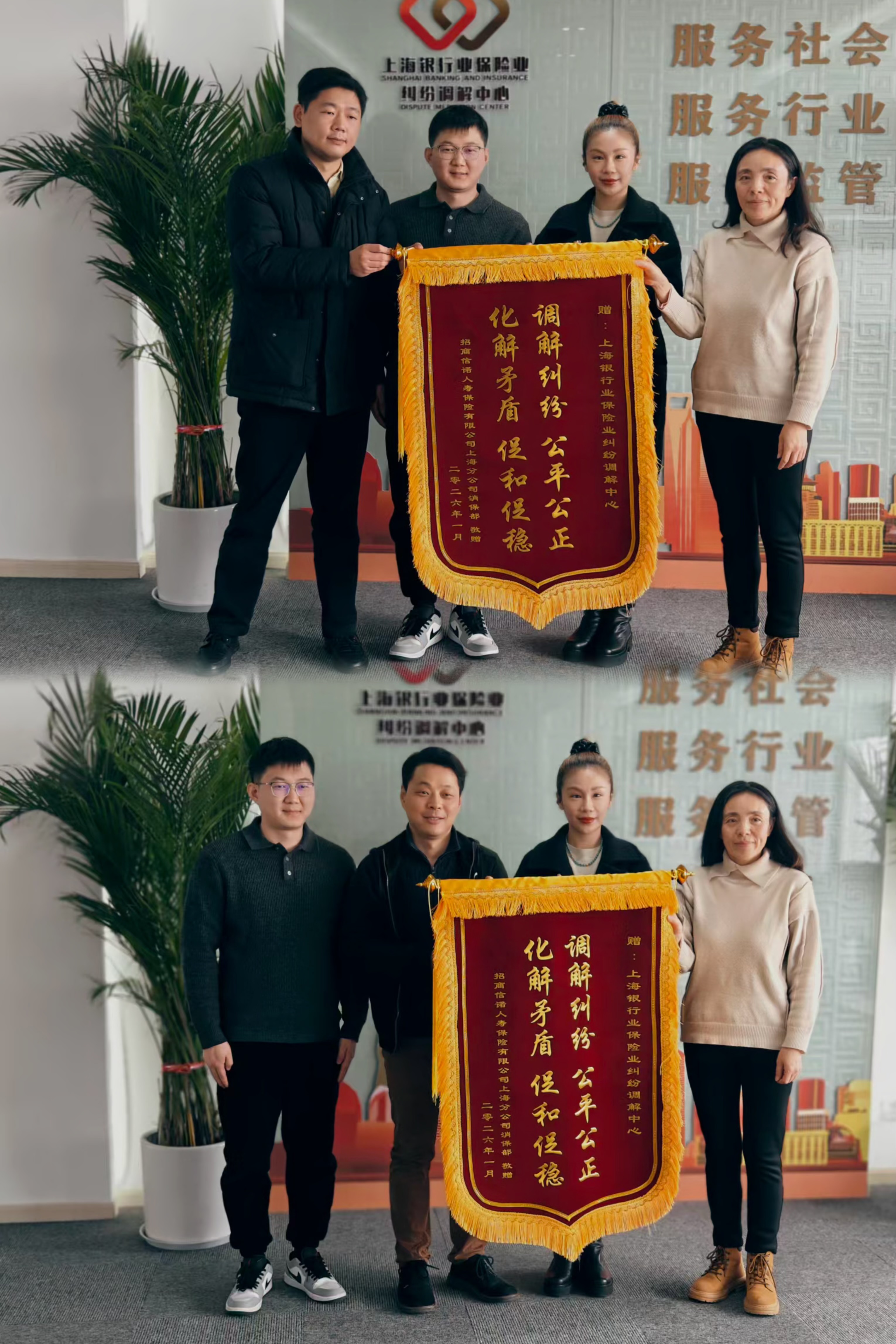 人寿保险有限公司上海分公司消保部怀着无比崇敬与感激之情,将这面绣有“调解纠纷公平公正、化解矛盾促和促稳”的锦旗送到上海银行业保险业务纠纷调解中心工作人员的手中,以表达我们最诚挚的谢意。