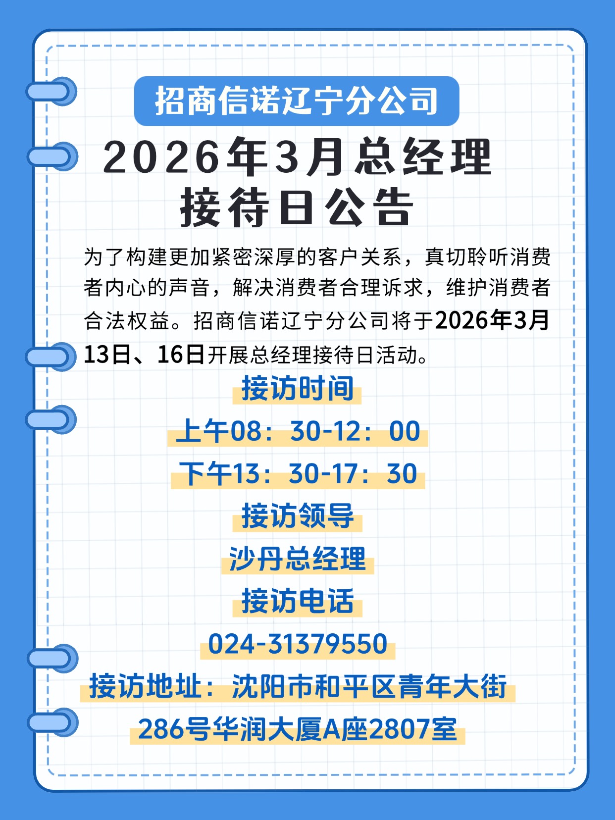招商信诺辽宁分公司增设2026年3月13日、16日总经理接待日公示