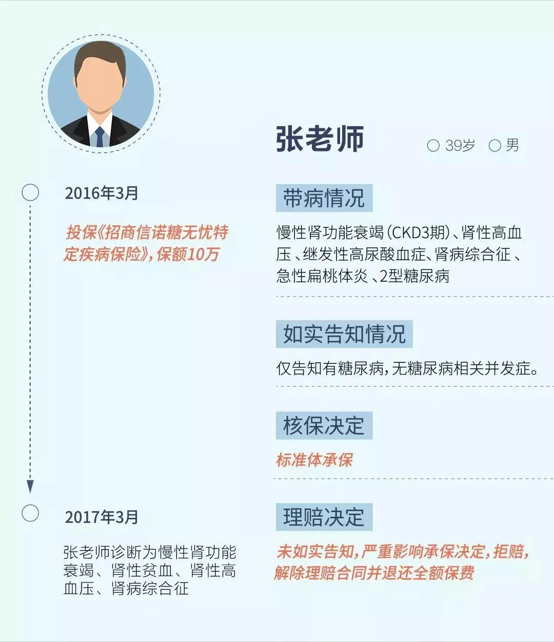 当他2017年患病后申请理赔时,经招商信诺调查核实,被保险人在2015年初已因“1.慢性肾功能衰竭(CKD3期)肾性高血压、继发性高尿酸血症 2.肾病综合征 3.2型糖尿病。”住院治疗。