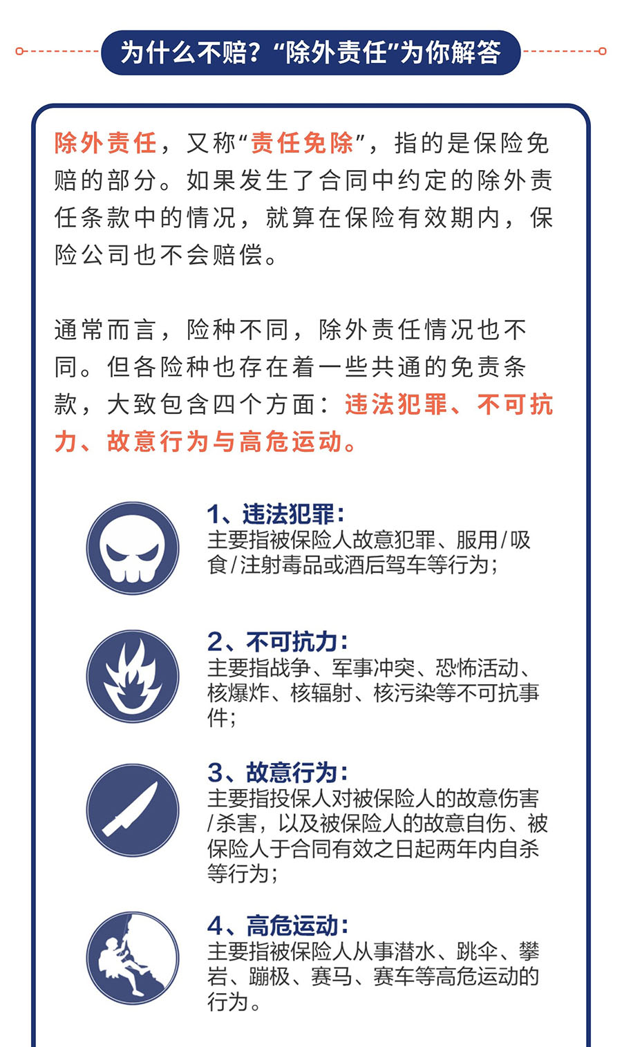 摘要:其实,除外责任于我们而言,并非是理赔上的“绊脚石”,也绝非是潜藏在保险合同中的“定时炸弹”。相反,除外责任是为了避免争议,更好的明确保障责任,保障保险人权益而制定的。