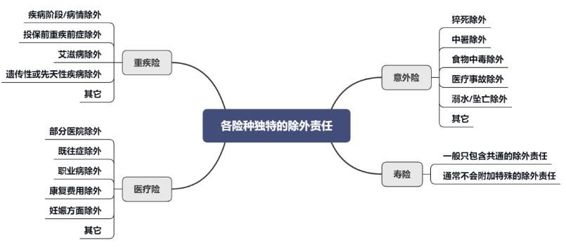 除了上述的共通除外责任之外,各险种还存在着特殊的除外责任: