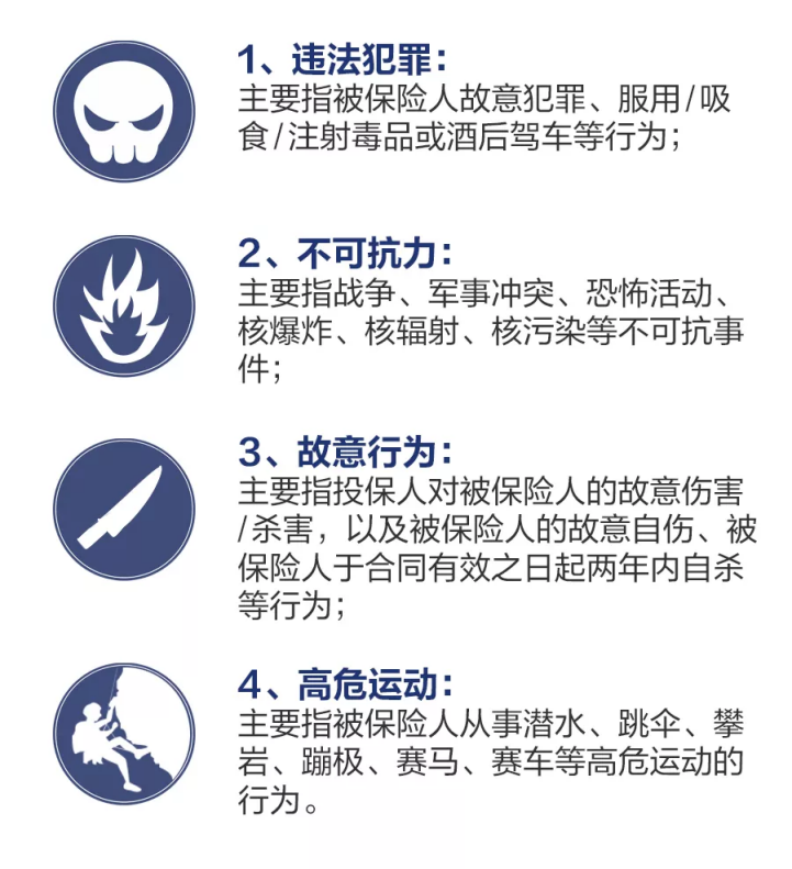 除外责任条款一般会比较长,读起来会有些吃力,一定要足够仔细,关注到每一个细节,避免遗漏。