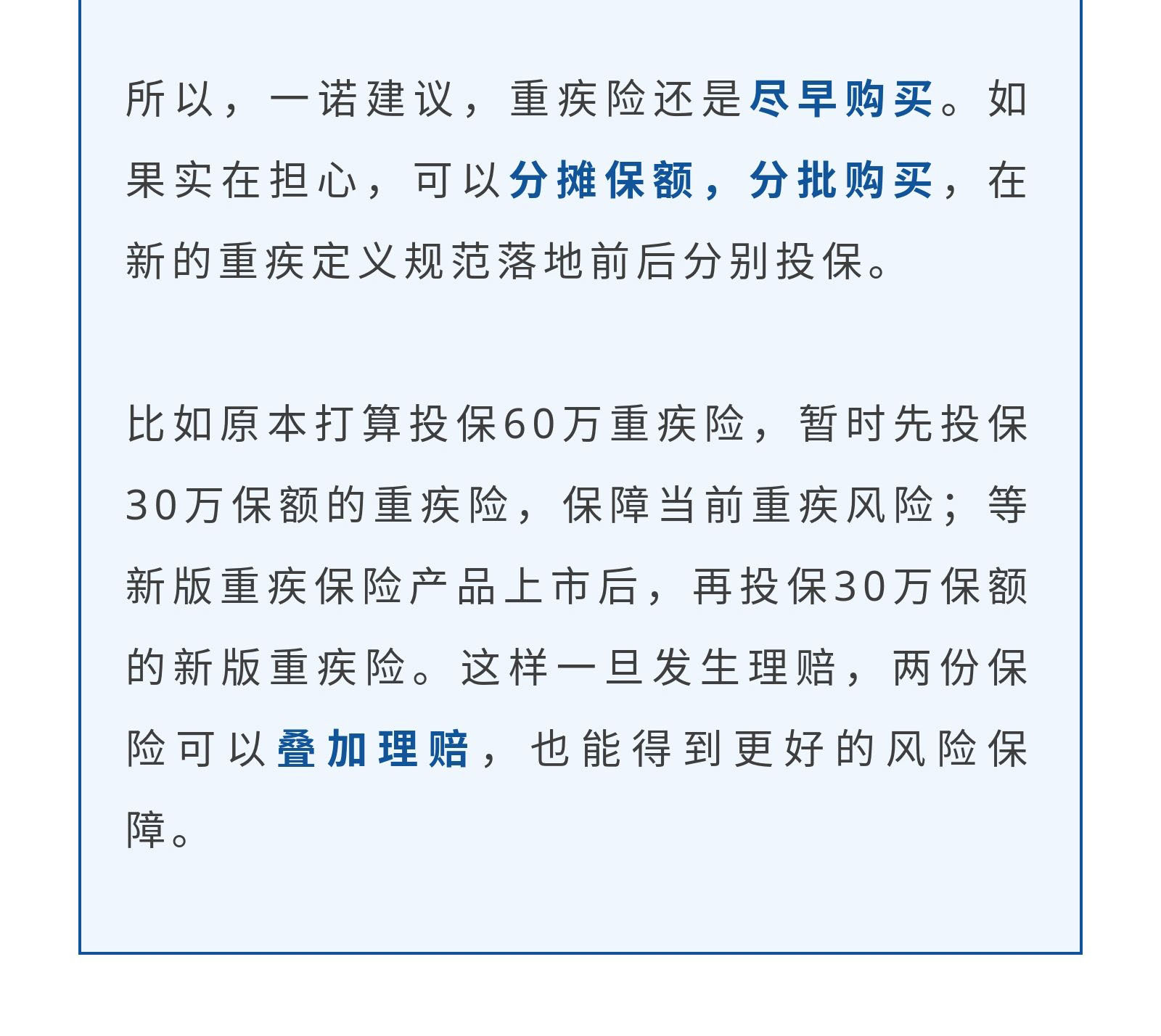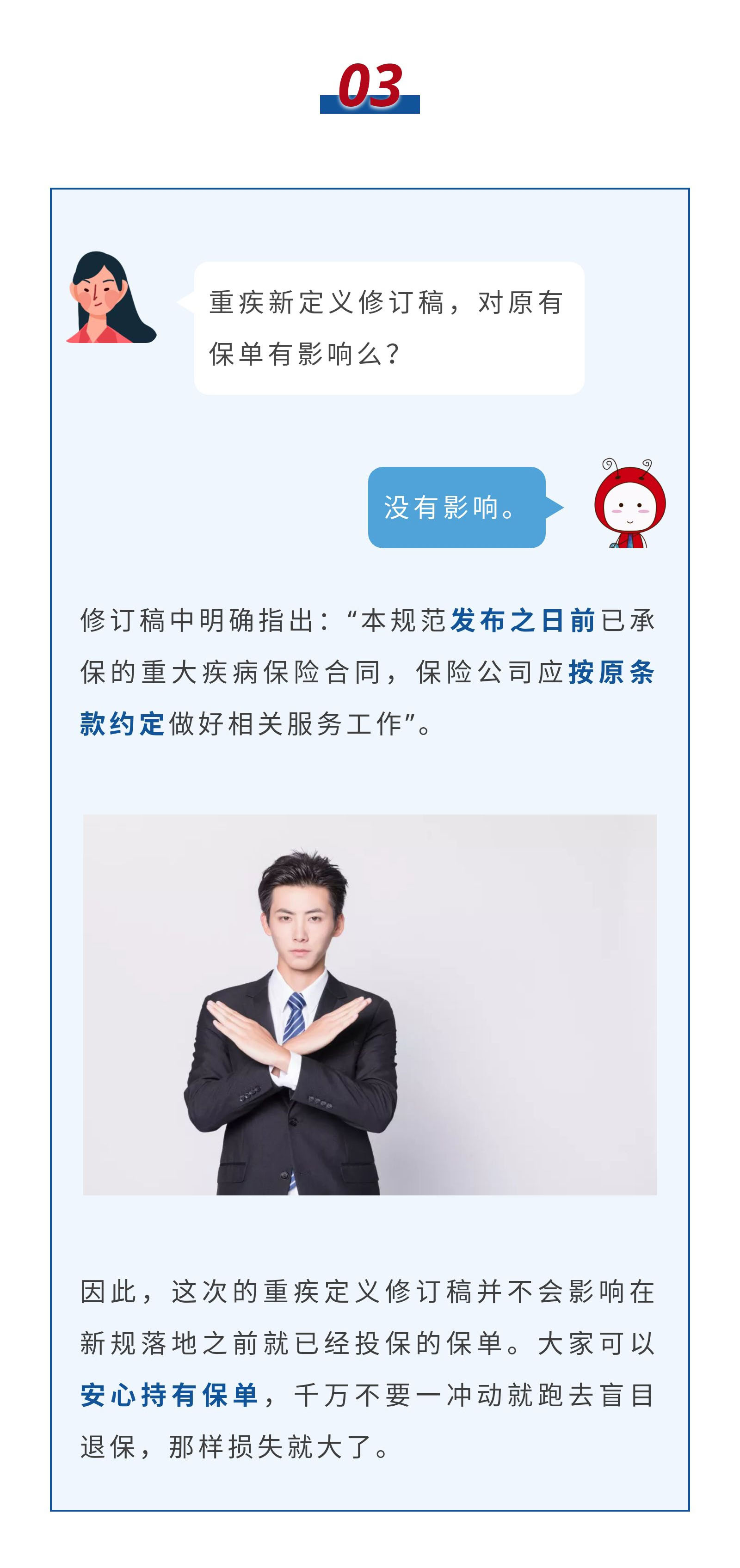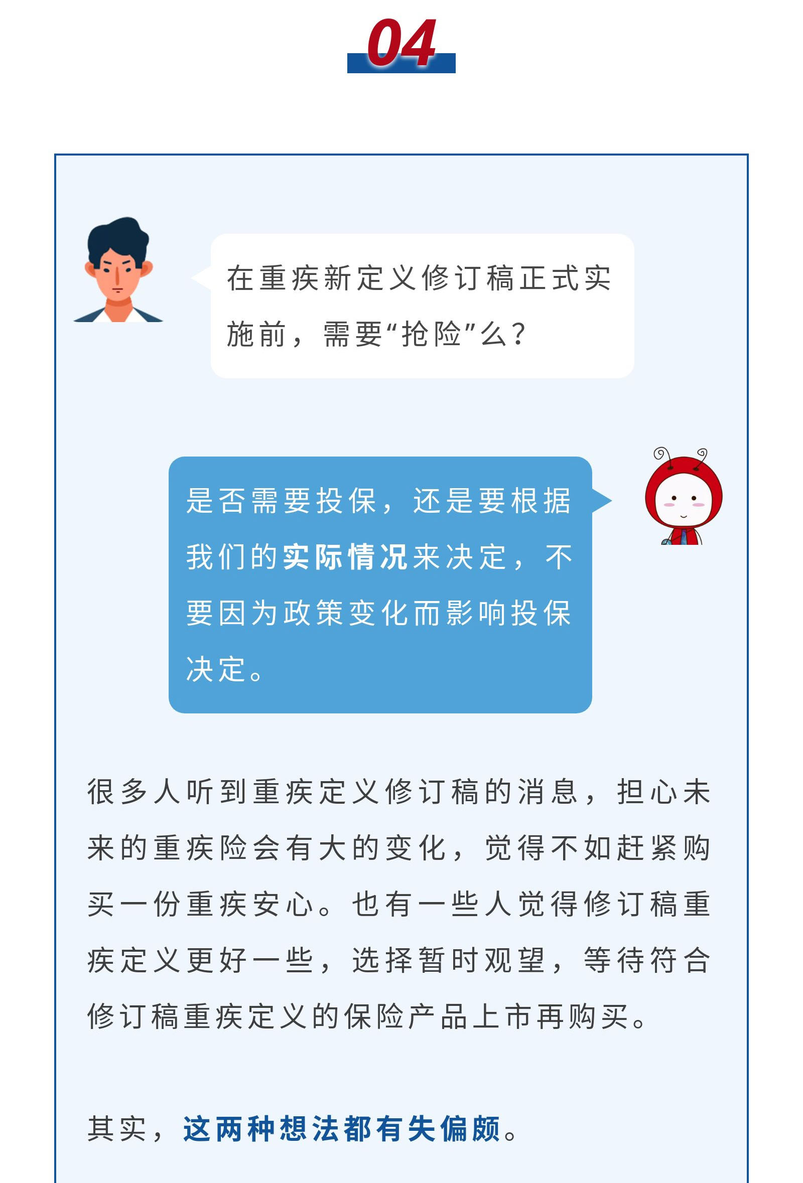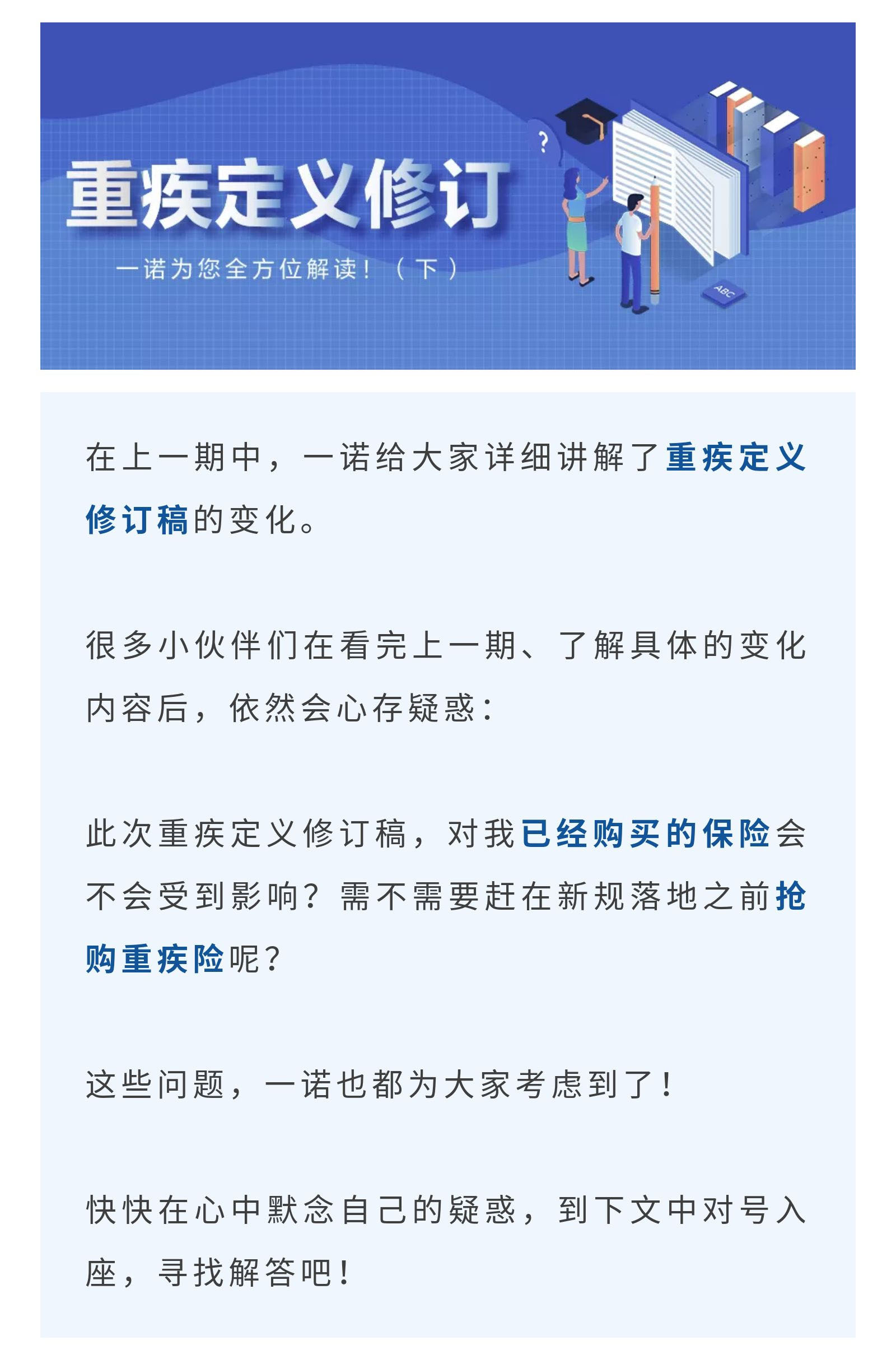 摘要:此次重疾定义修订稿,对我已经购买的保险会不会受到影响?需不需要赶在新规落地之前抢购重疾险呢?