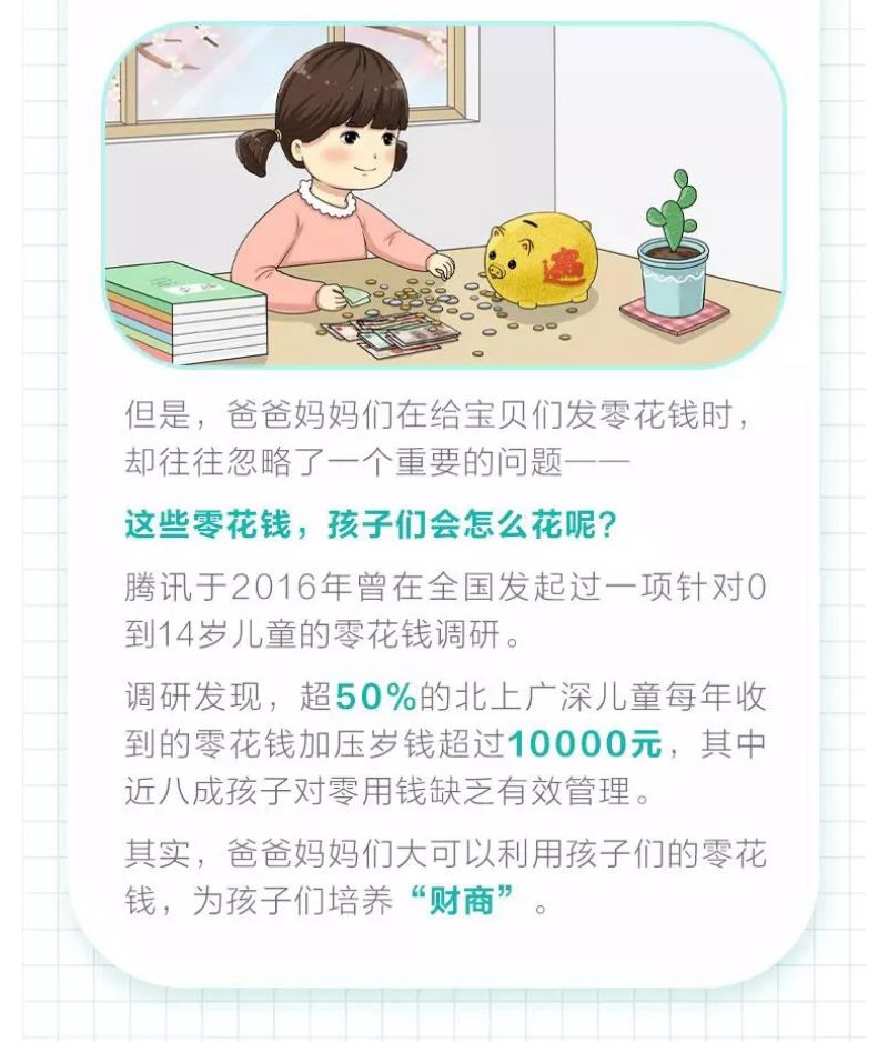 摘要:腾讯于2016年曾在全国发起过一项针对0到14岁儿童的零花钱调研。调研发现,超50%的北上广深儿童每年收到的零花钱加压岁钱超过10000元,其中近八成孩子对零用钱缺乏有效管理。