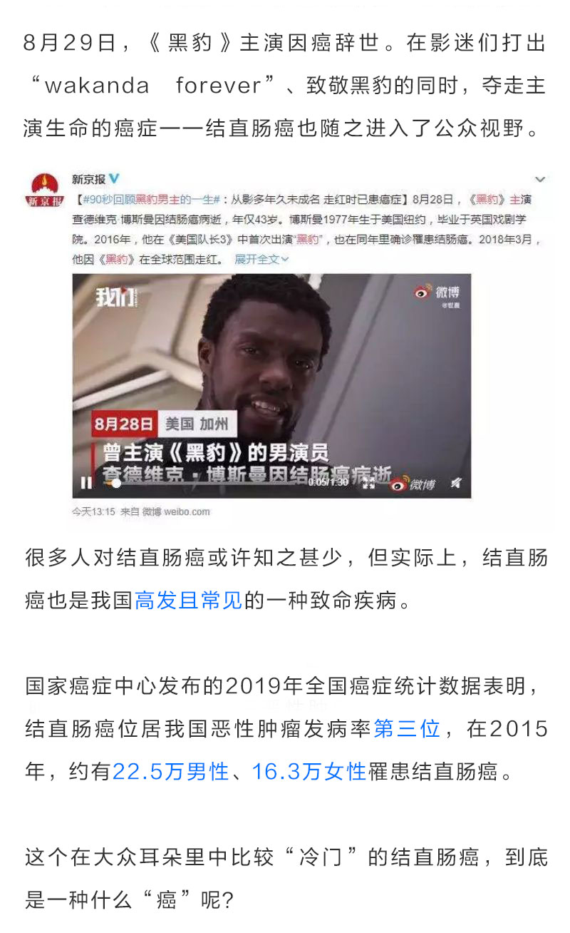 摘要:8月29日,《黑豹》主演因癌辞世。在影迷们打出“wakanda forever”、致敬黑豹的同时,夺走主演生命的癌症——结直肠癌也随之进入了公众视野。