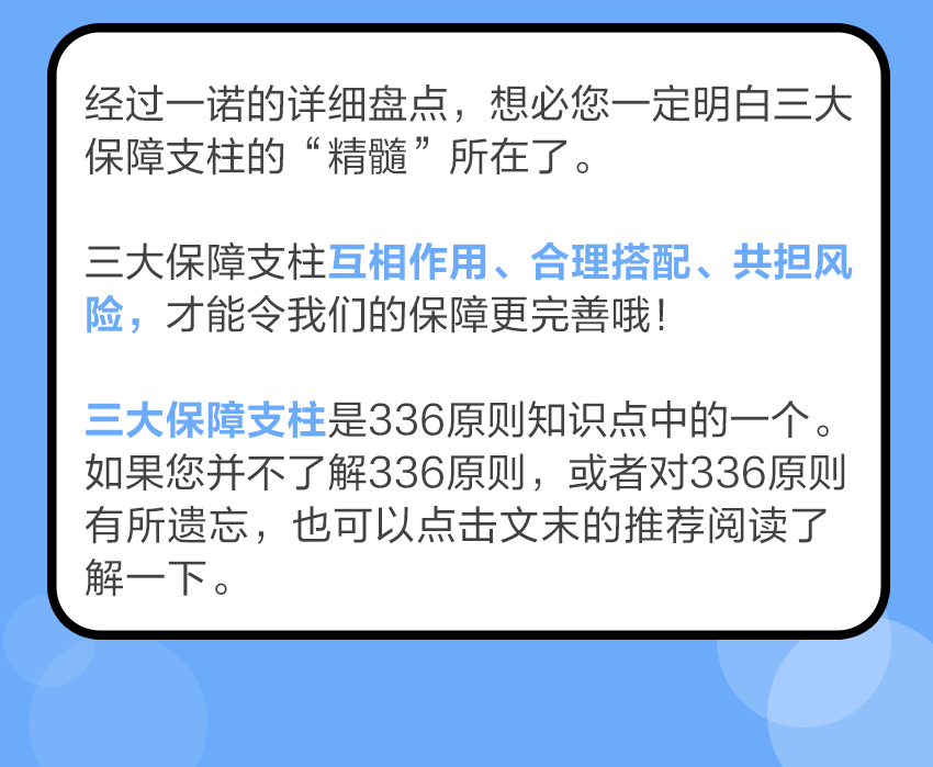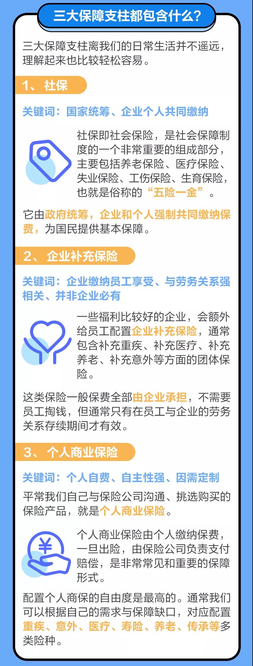 摘要:社保、企业补充保险和商业保险共同组成了三大保障支柱。三大保障支柱互相作用、合理搭配、共担风险,才能令我们的保障更完善!