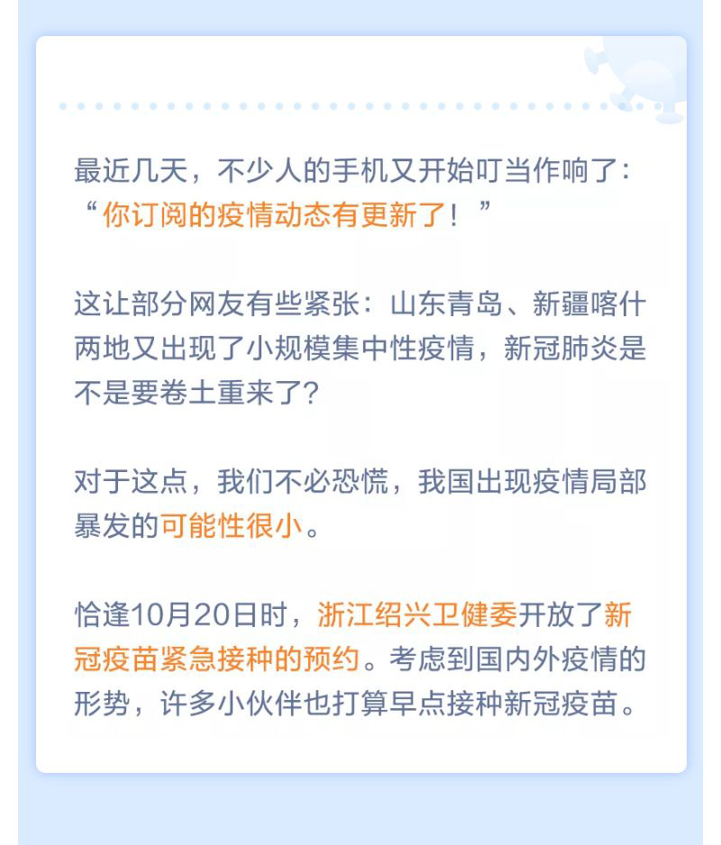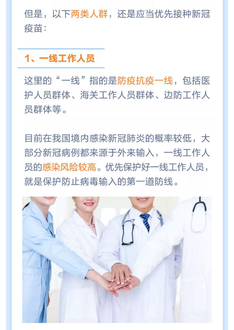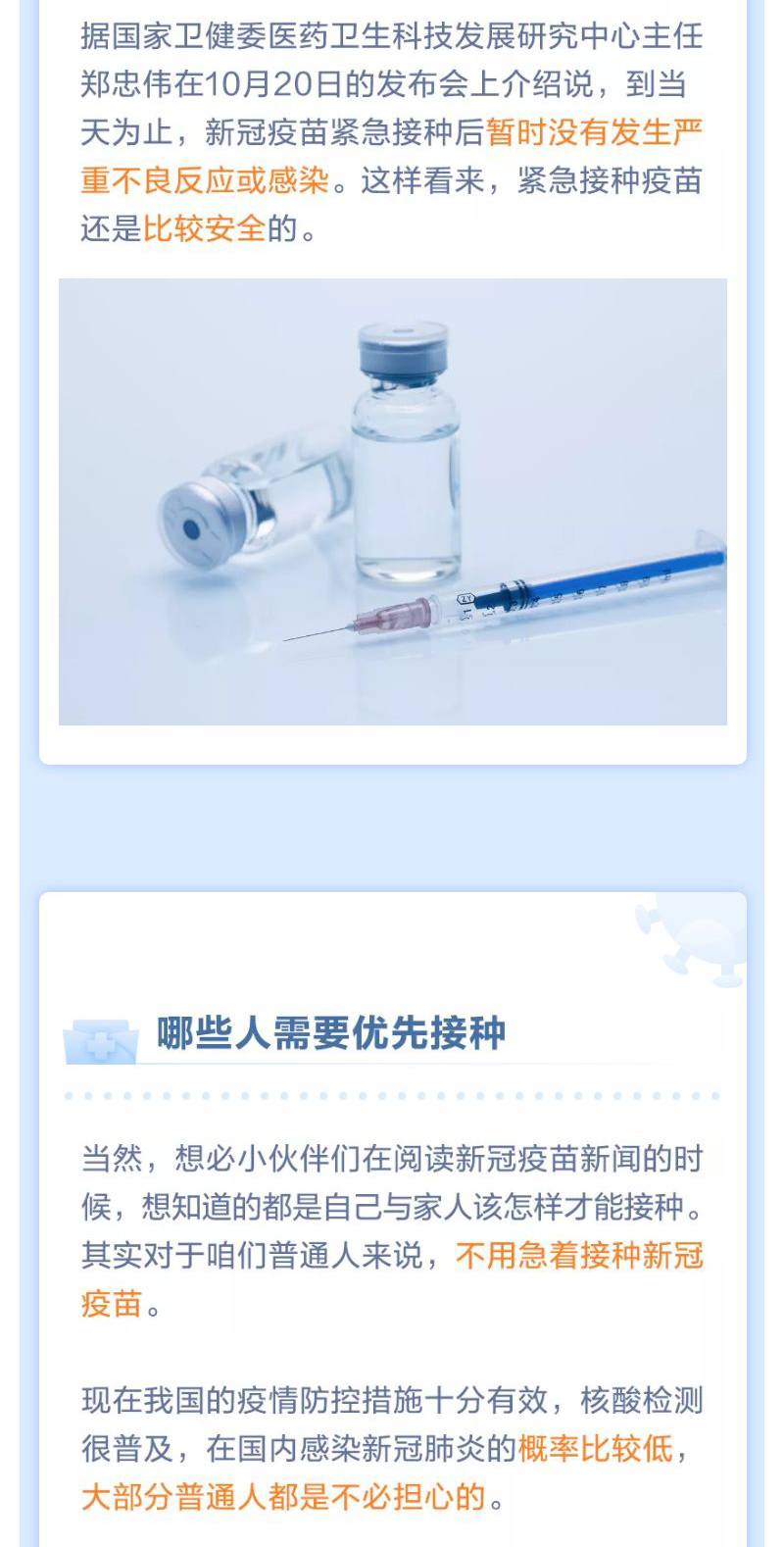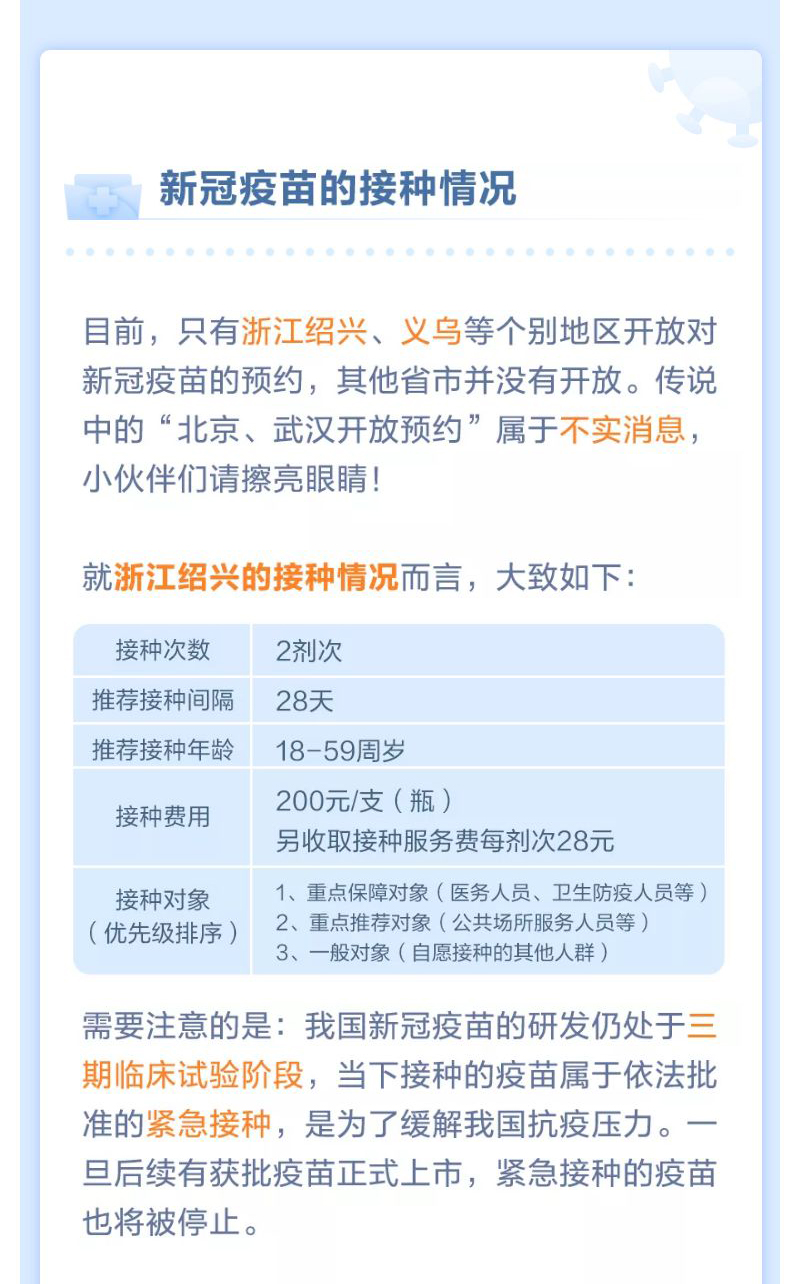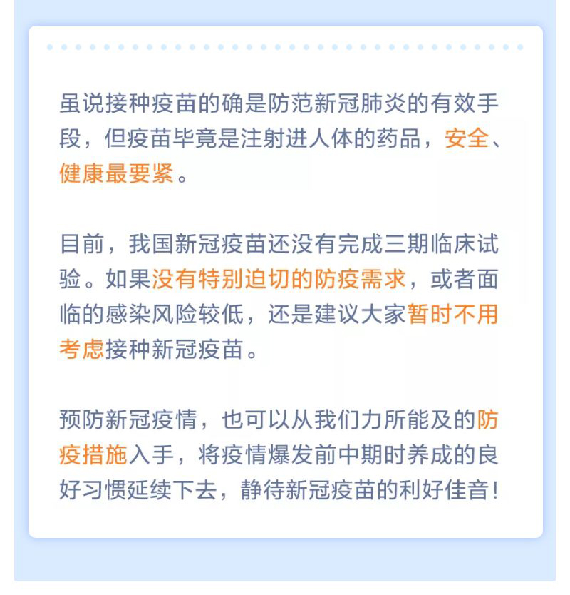 摘要:目前,我国新冠疫苗还没有完成三期临床试验。如果没有特别迫切的防疫需求,或者面临的感染风险较低,还是建议大家暂时不用考虑接种新冠疫苗。预防新冠疫情,也可以从我们力所能及的防疫措施入手,将疫情爆发前中期时养成的良好习惯延续下去,静待新冠疫苗的利好佳音!
