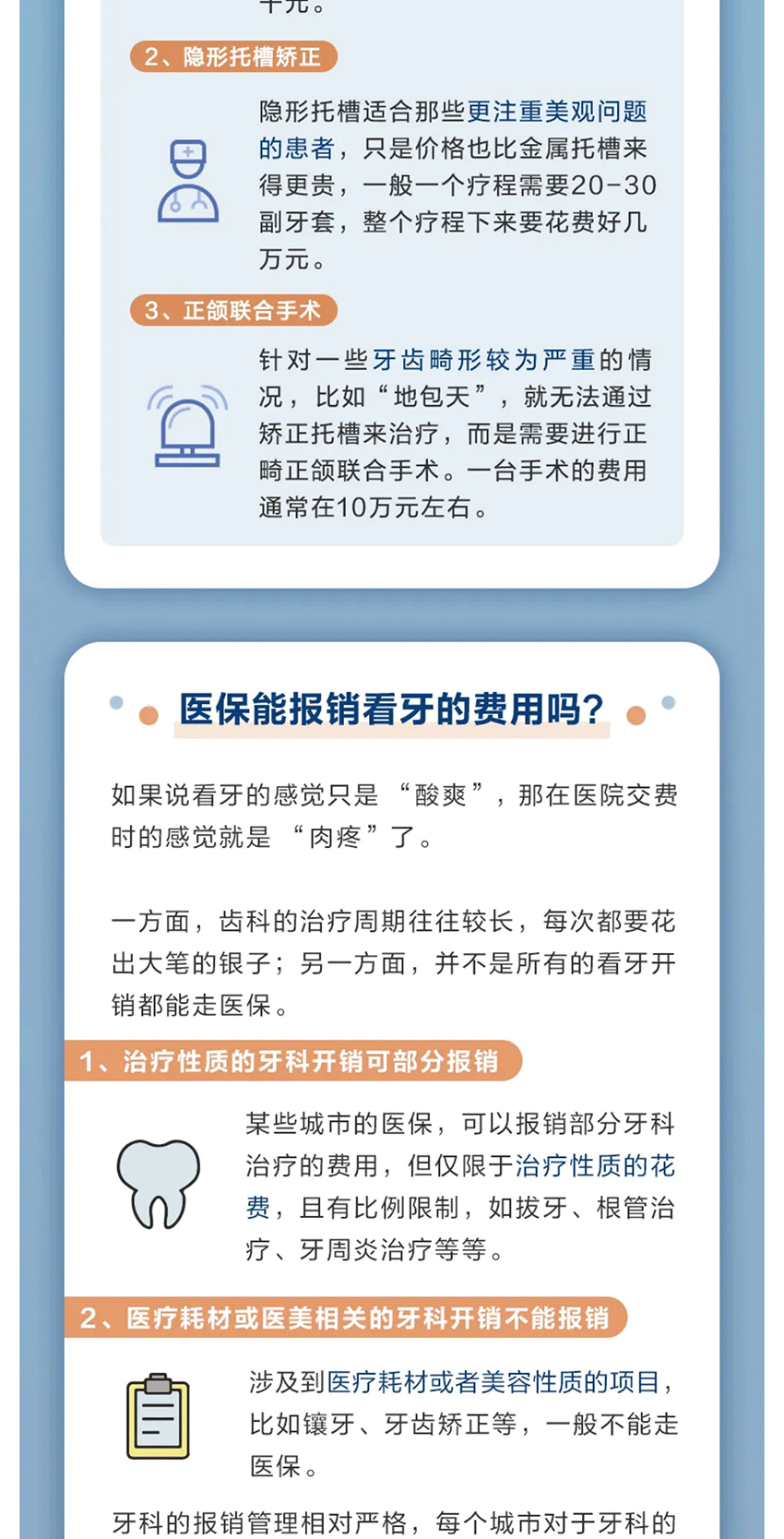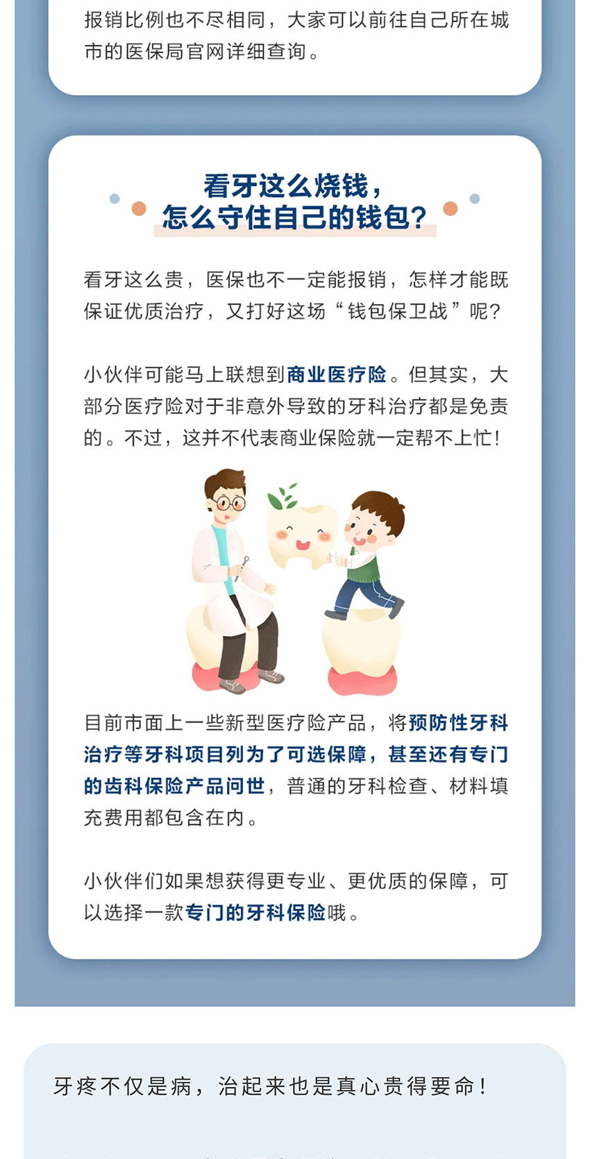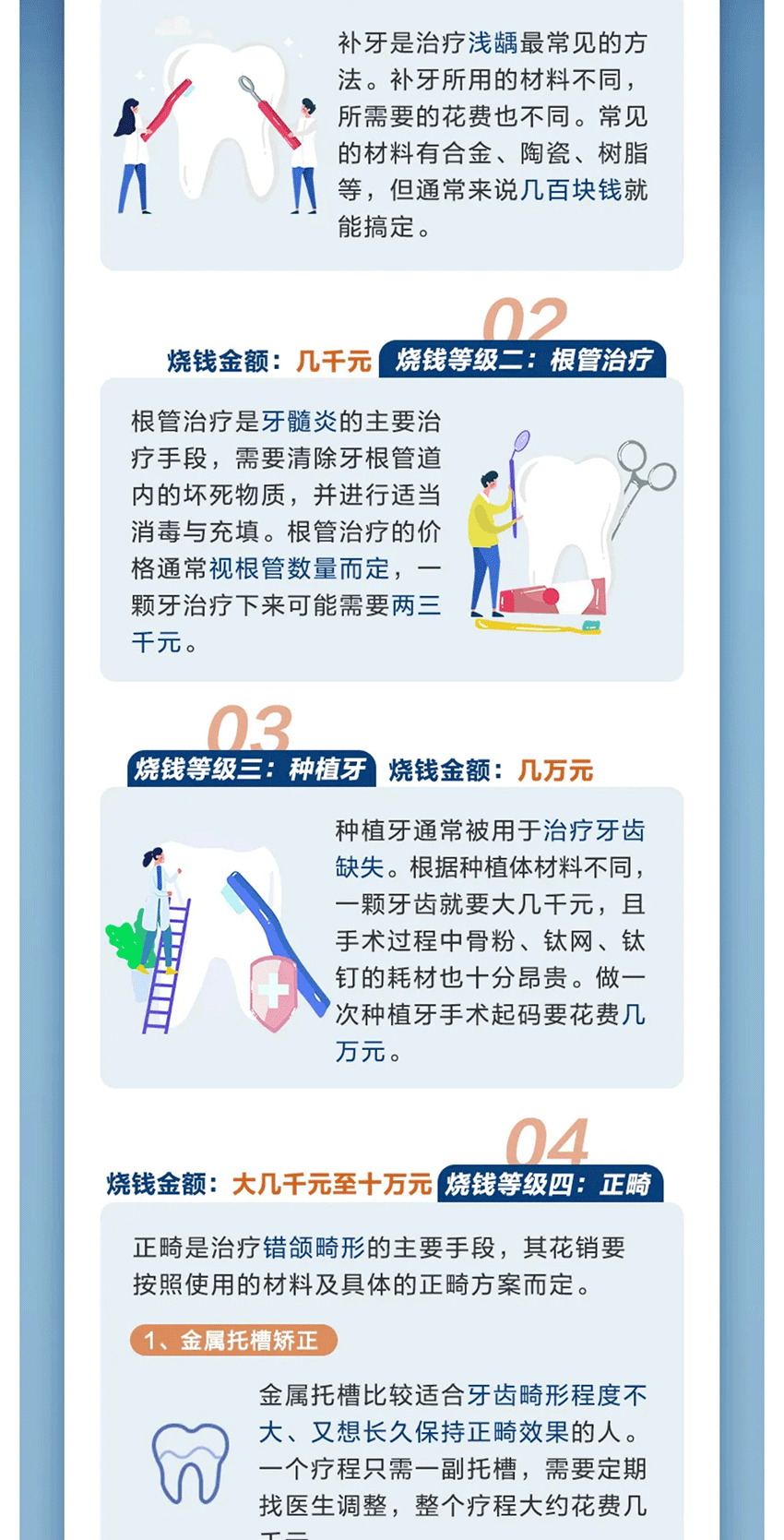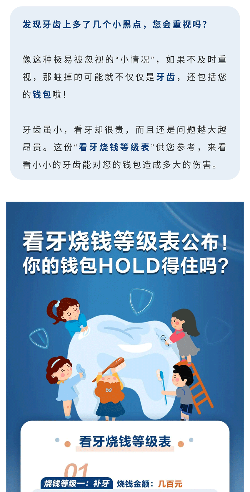 摘要:发现牙齿上多了几个小黑点,您会重视吗?像这种极易被忽视的“小情况”,如果不及时重视,那蛀掉的可能就不仅仅是牙齿,还包括您的钱包啦! 牙齿虽小,看牙却很贵,而且还是问题越大越昂贵。这份“看牙烧钱等级表”供您参考,来看看小小的牙齿能对您的钱包造成多大的伤害。