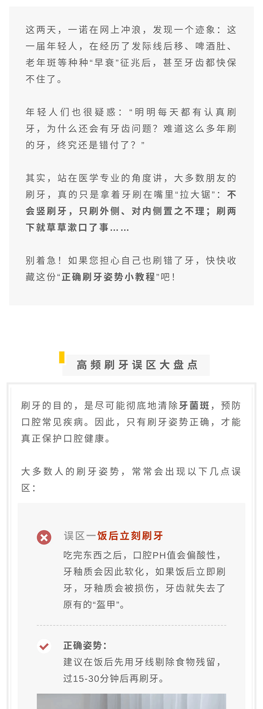 摘要:这两天,一诺在网上冲浪,发现一个迹象:这一届年轻人,在经历了发际线后移、啤酒肚、老年斑等种种“早衰”征兆后,甚至牙齿都快保不住了。年轻人们也很疑惑:“明明每天都有认真刷牙,为什么还会有牙齿问题?难道这么多年刷的牙,终究还是错付了?”别着急!如果您担心自己也刷错了牙,快快收藏这份“正确刷牙姿势小教程”吧!