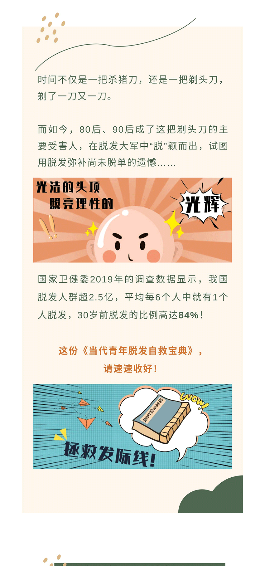 国家卫健委2019年的调查数据显示,我国脱发人群超2.5亿,平均每6个人中就有1个人脱发,30岁前脱发的比例高达84%!这份《当代青年脱发自救宝典》,请速速收好!
