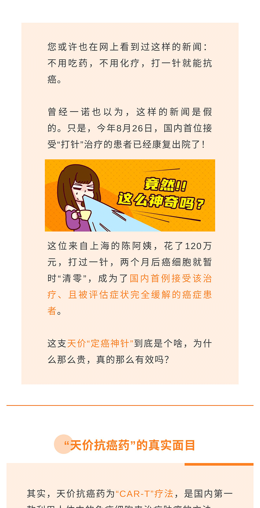 摘要:您或许也在网上看到过这样的新闻:不用吃药,不用化疗,打一针就能抗癌。曾经一诺也以为,这样的新闻是假的。只是,今年8月26日,国内首位接受“打针”治疗的患者已经康复出院了!这支天价“定癌神针”到底是个啥,为什么那么贵,真的那么有效吗?