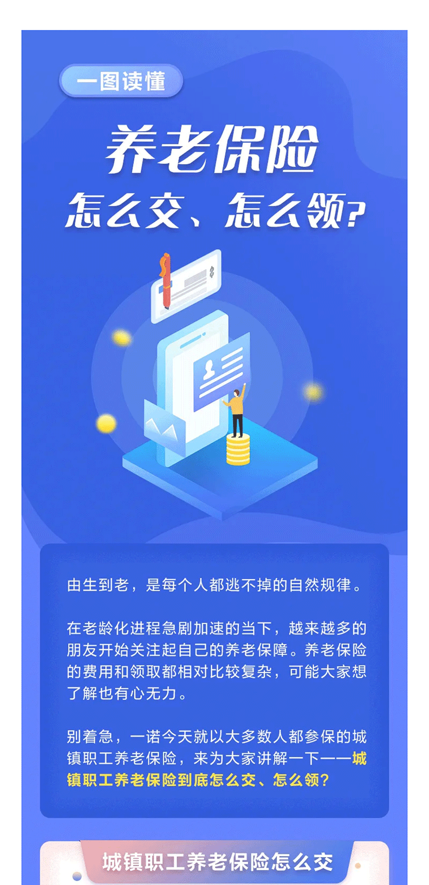 摘要:在老龄化进程急剧加速的当下,越来越多的朋友开始关注起自己的养老保障。养老保险的费用和领取都相对比较复杂,可能大家想了解也有心无力。一诺今天就以大多数人都参保的城镇职工养老保险,来为大家讲解一下——城镇职工养老保险到底怎么交、怎么领?