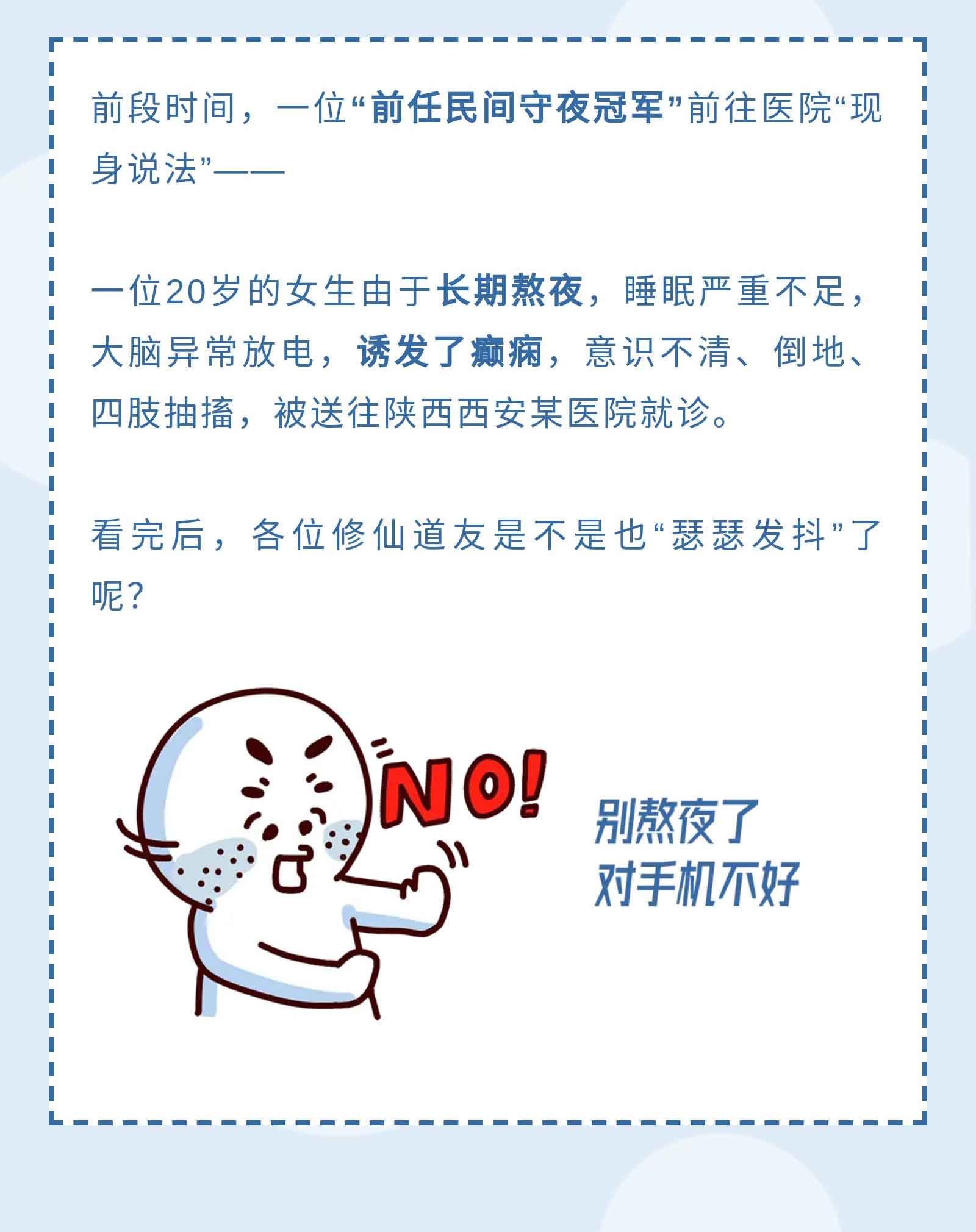 摘要:前段时间,一位“前任民间守夜冠军”前往医院“现身说法”——一位20岁的女生由于长期熬夜,睡眠严重不足,大脑异常放电,诱发了癫痫,意识不清、倒地、四肢抽搐,被送往陕西西安某医院就诊。