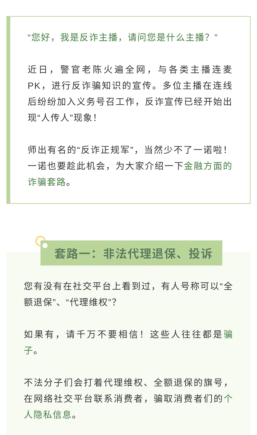 摘要:“您好,我是反诈主播,请问您是什么主播?”近日,警官老陈火遍全网,与各类主播连麦PK,进行反诈骗知识的宣传。多位主播在连线后纷纷加入义务号召工作,反诈宣传已经开始出现“人传人”现象! 师出有名的“反诈正规军”,当然少不了一诺啦!一诺也要趁此机会,为大家介绍一下金融方面的诈骗套路。