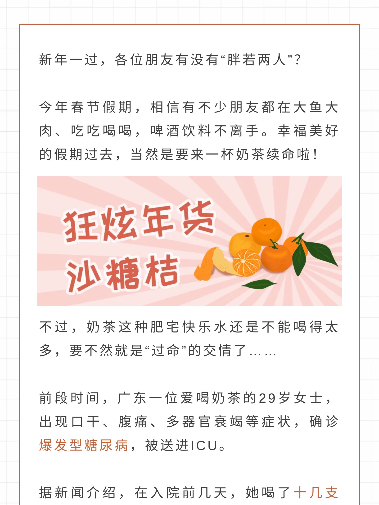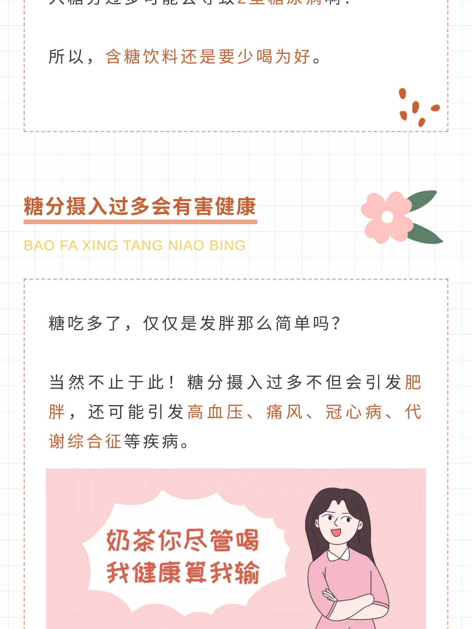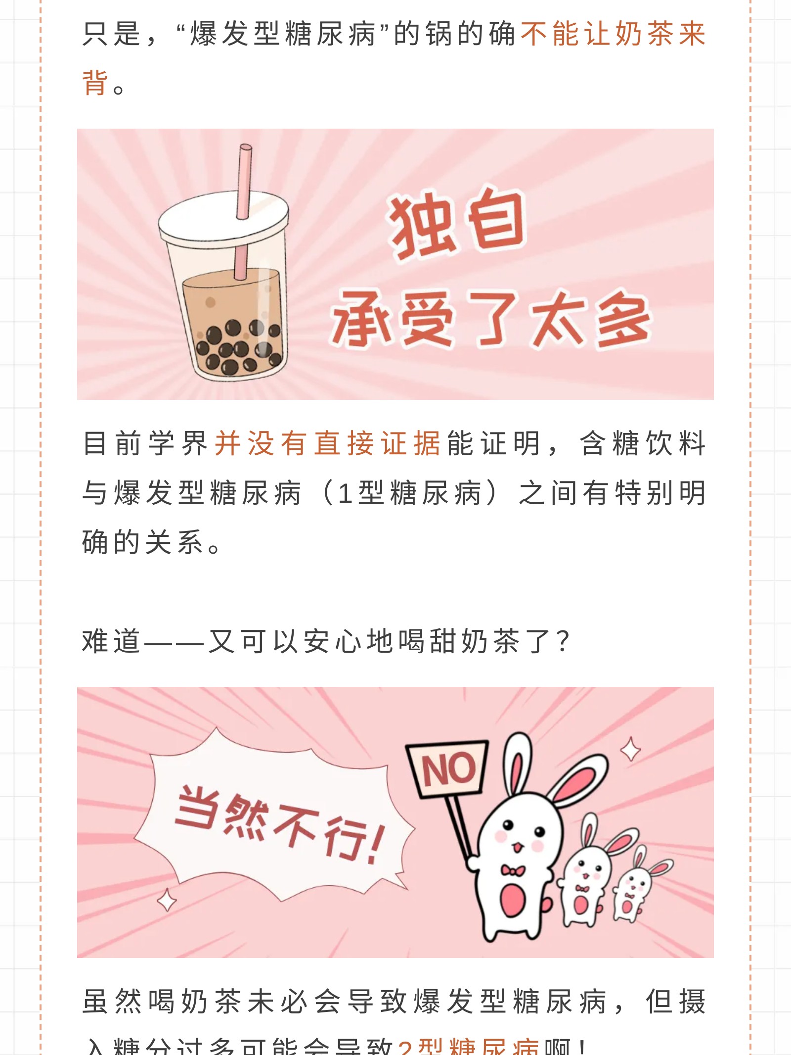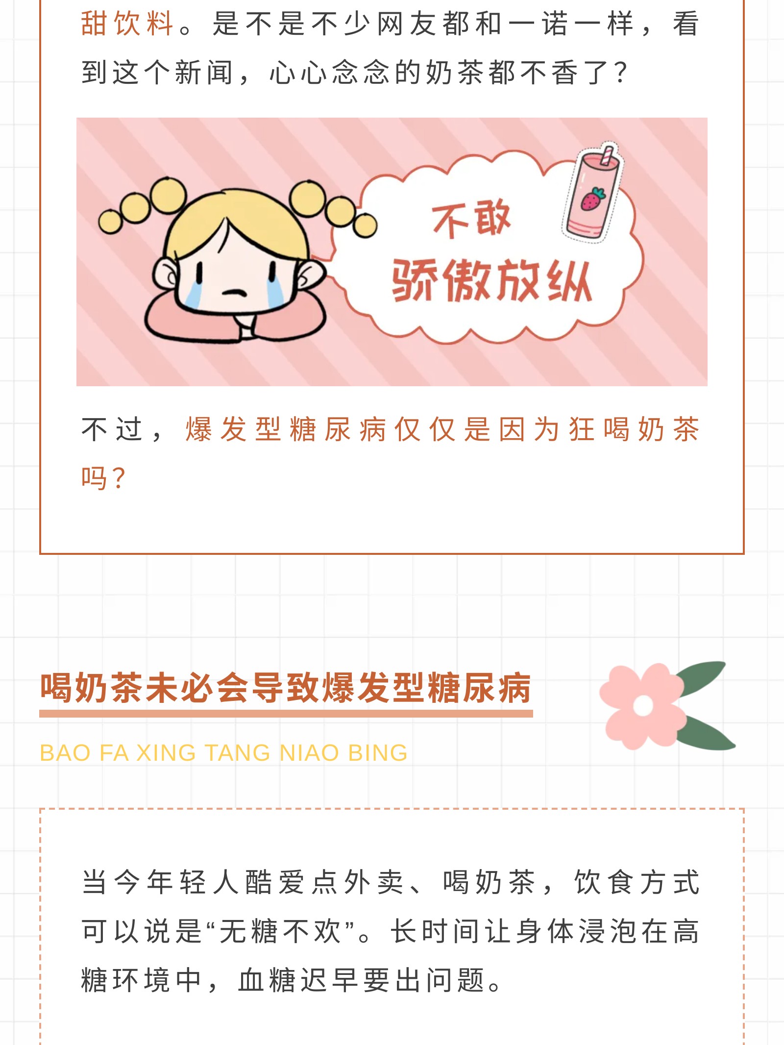摘要:目前学界没有直接证据能证明爆发性糖尿病(1型糖尿病)与含糖饮料之间有特别明确关系,糖尿病的病发不全是由奶茶导致,不过奶茶还是少喝为主,糖分摄入过多会导致2型糖尿病发生,同时糖分摄入过多,危害也很多。我们要健康饮食,做好“控糖”。