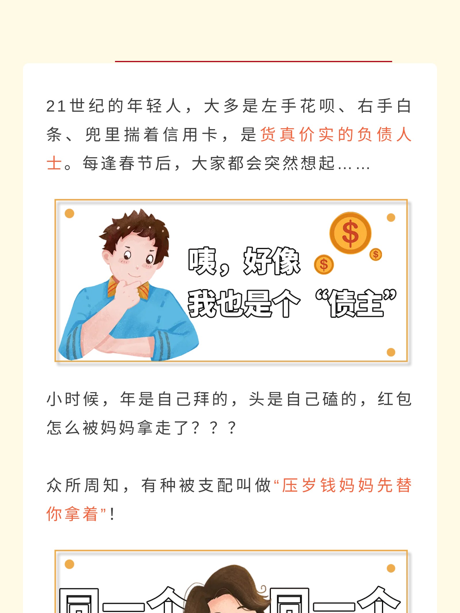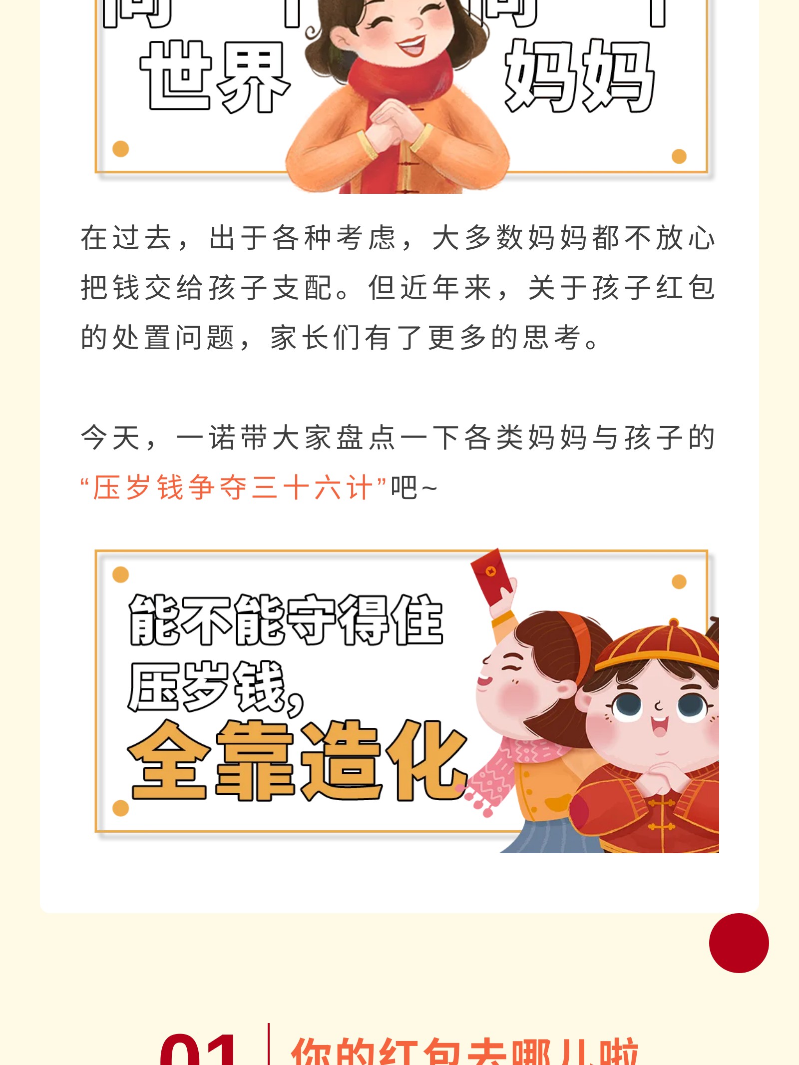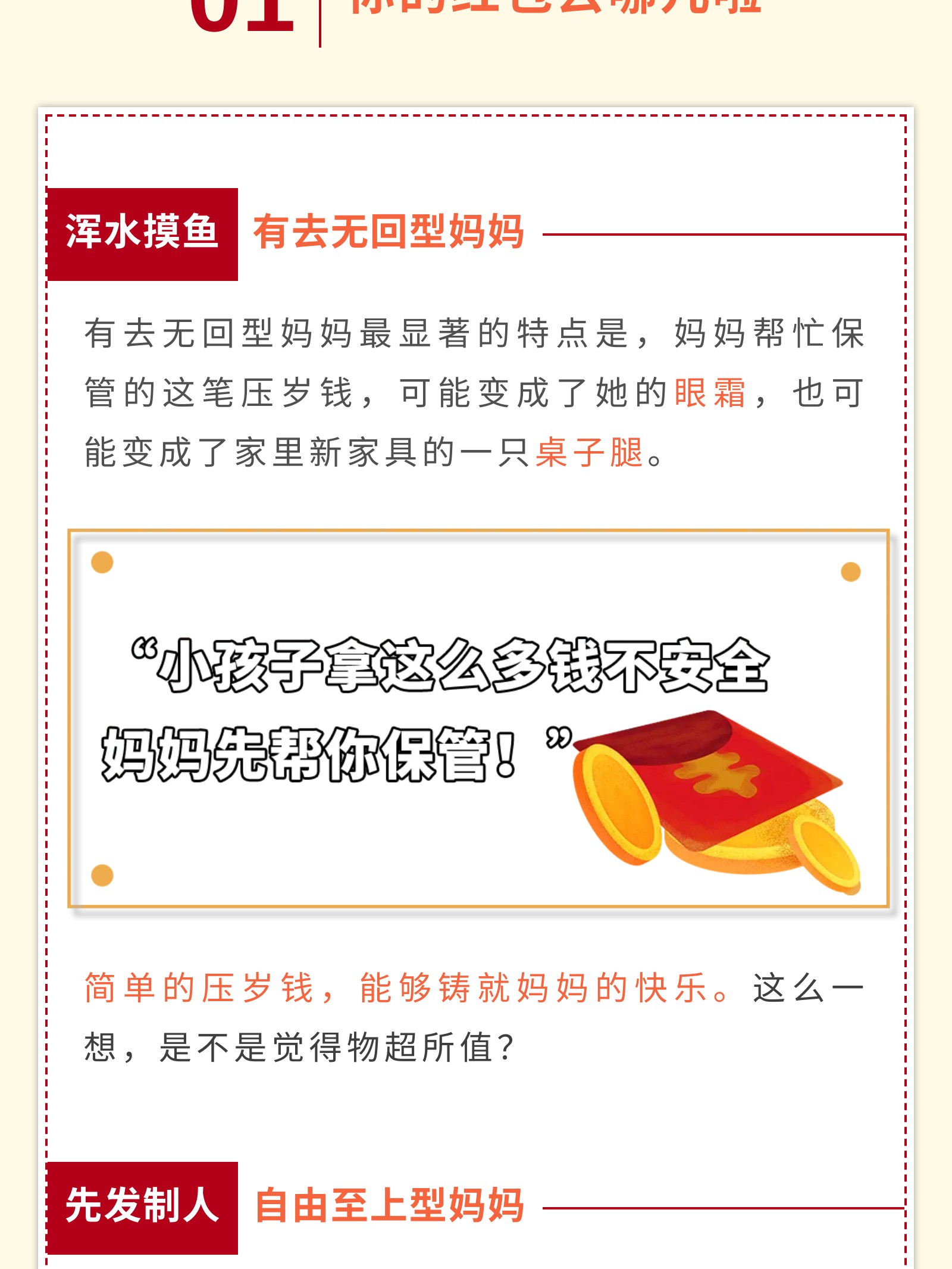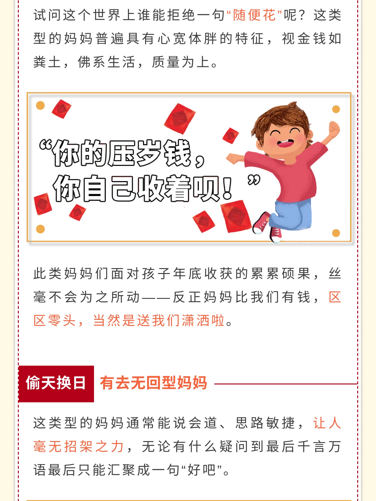 摘要:同一个世界同一个妈妈,“压岁钱妈妈先帮你保管”各类妈妈与孩子的压岁钱争夺记,有“浑水摸鱼有去无回型妈妈”,“先发制人自由至上型妈妈”,“偷天换日有去无回型妈妈”等。 科普红包的正确使用姿势,为孩子配置保险-推陈出新保障经纪人型妈妈。