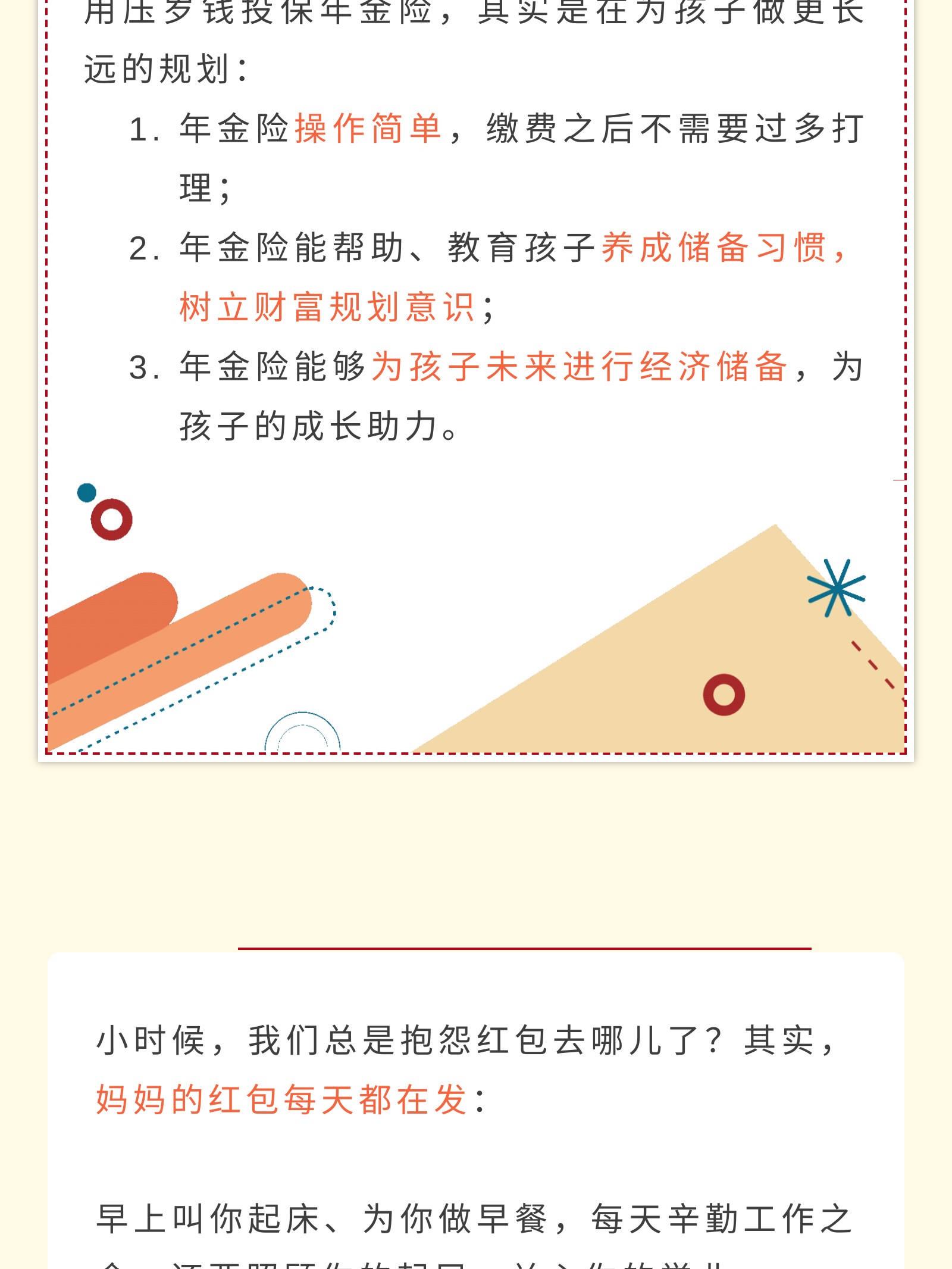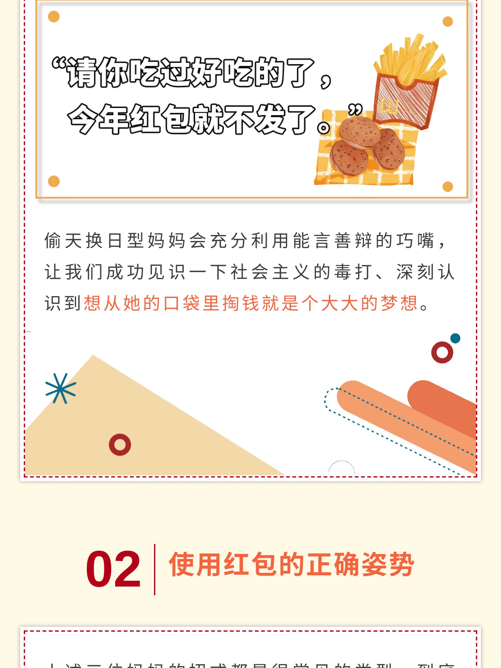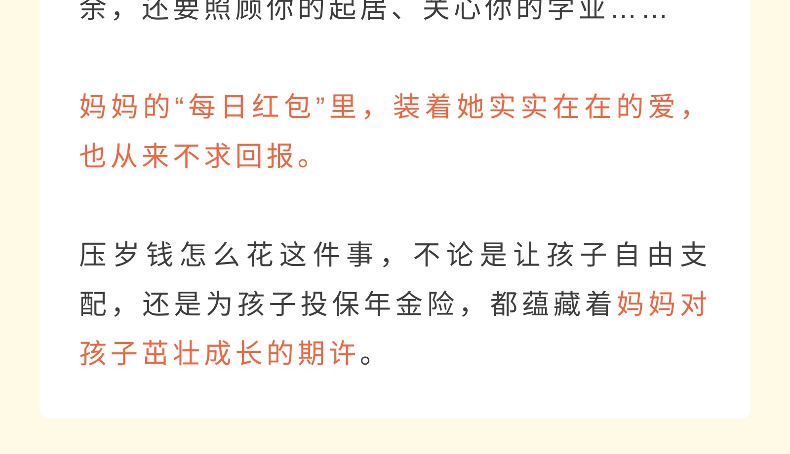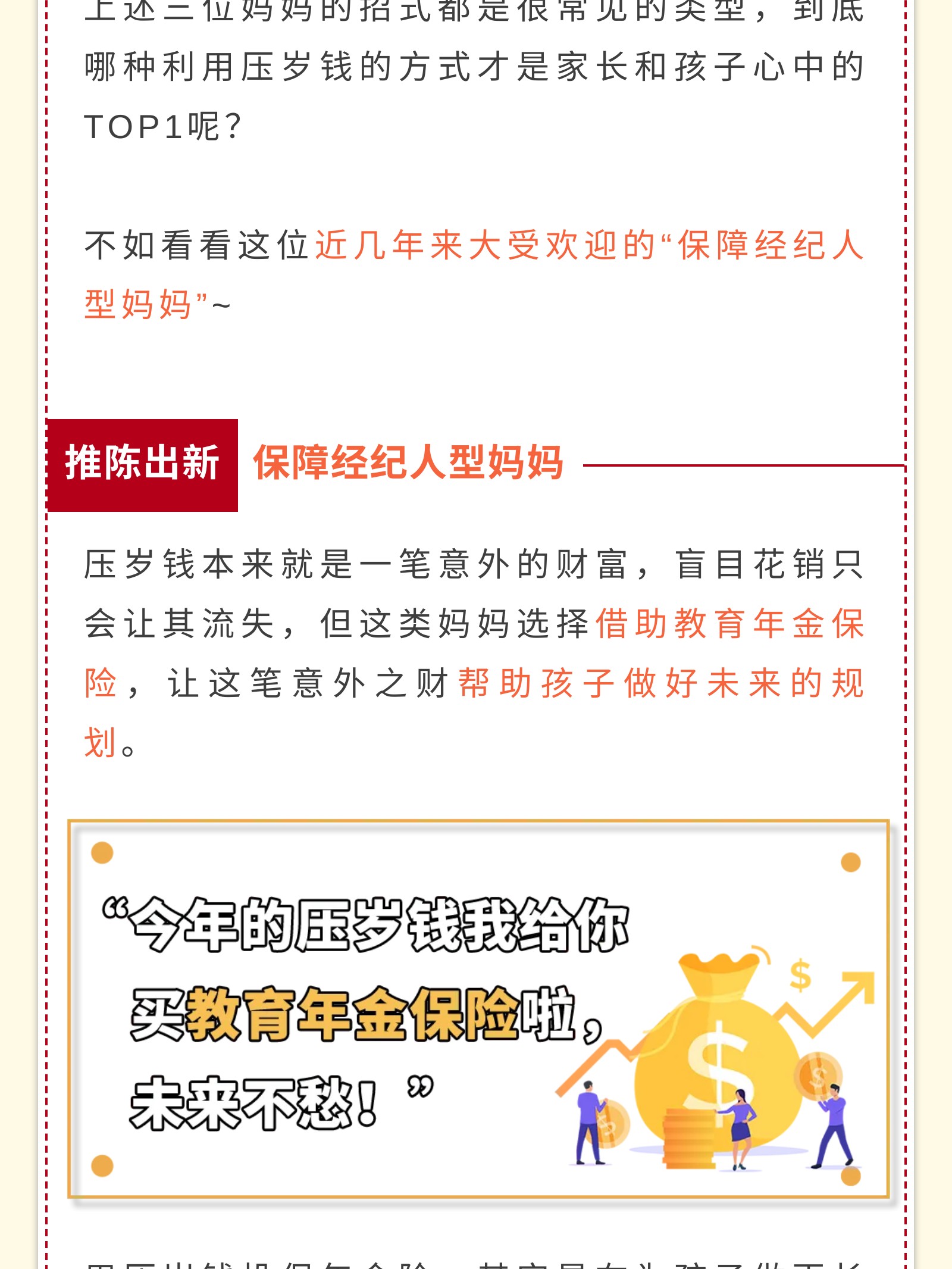 摘要:同一个世界同一个妈妈,“压岁钱妈妈先帮你保管”各类妈妈与孩子的压岁钱争夺记,有“浑水摸鱼有去无回型妈妈”,“先发制人自由至上型妈妈”,“偷天换日有去无回型妈妈”等。 科普红包的正确使用姿势,为孩子配置保险-推陈出新保障经纪人型妈妈。