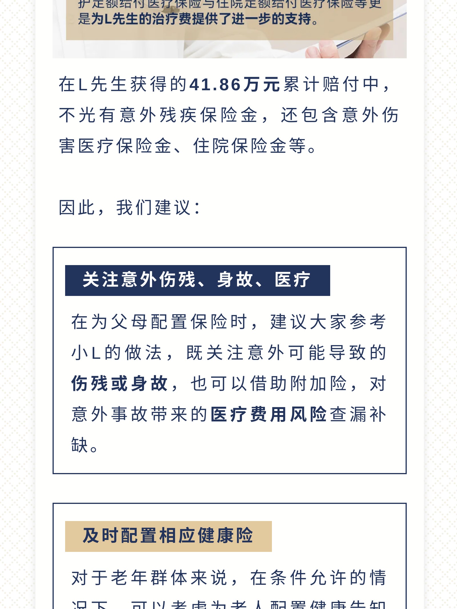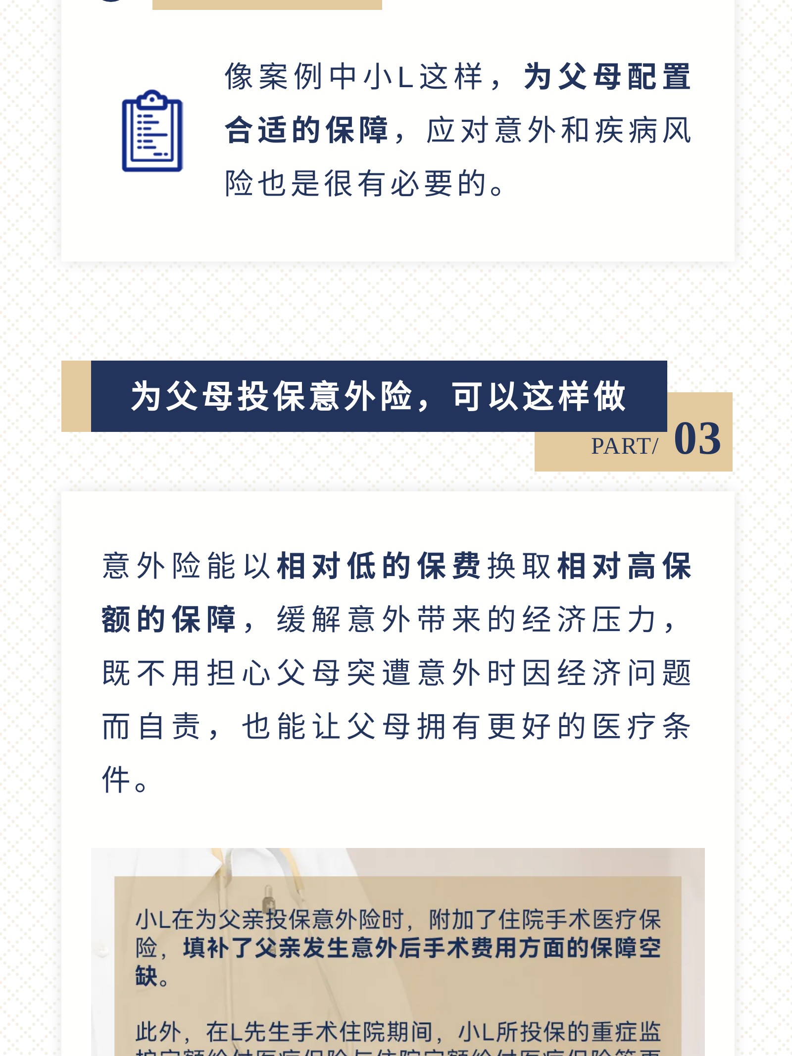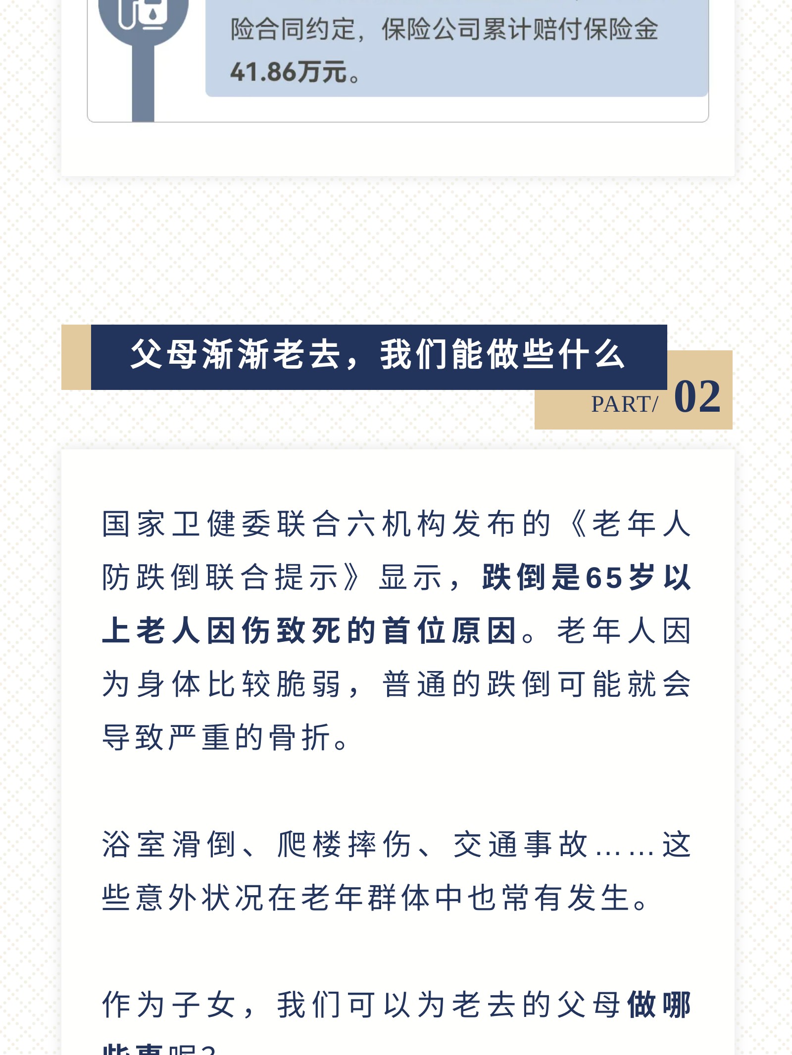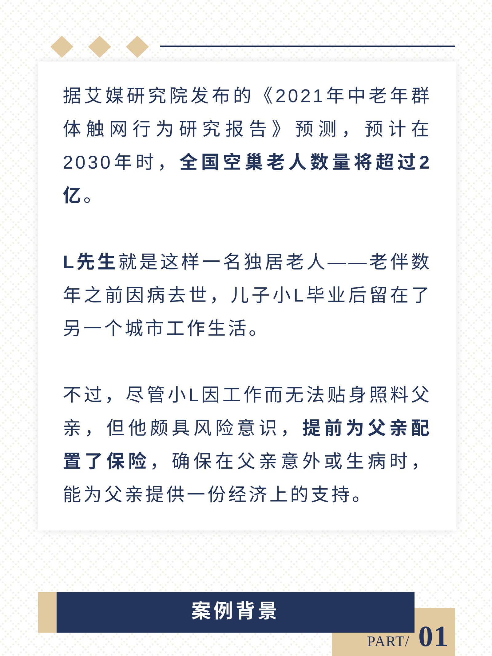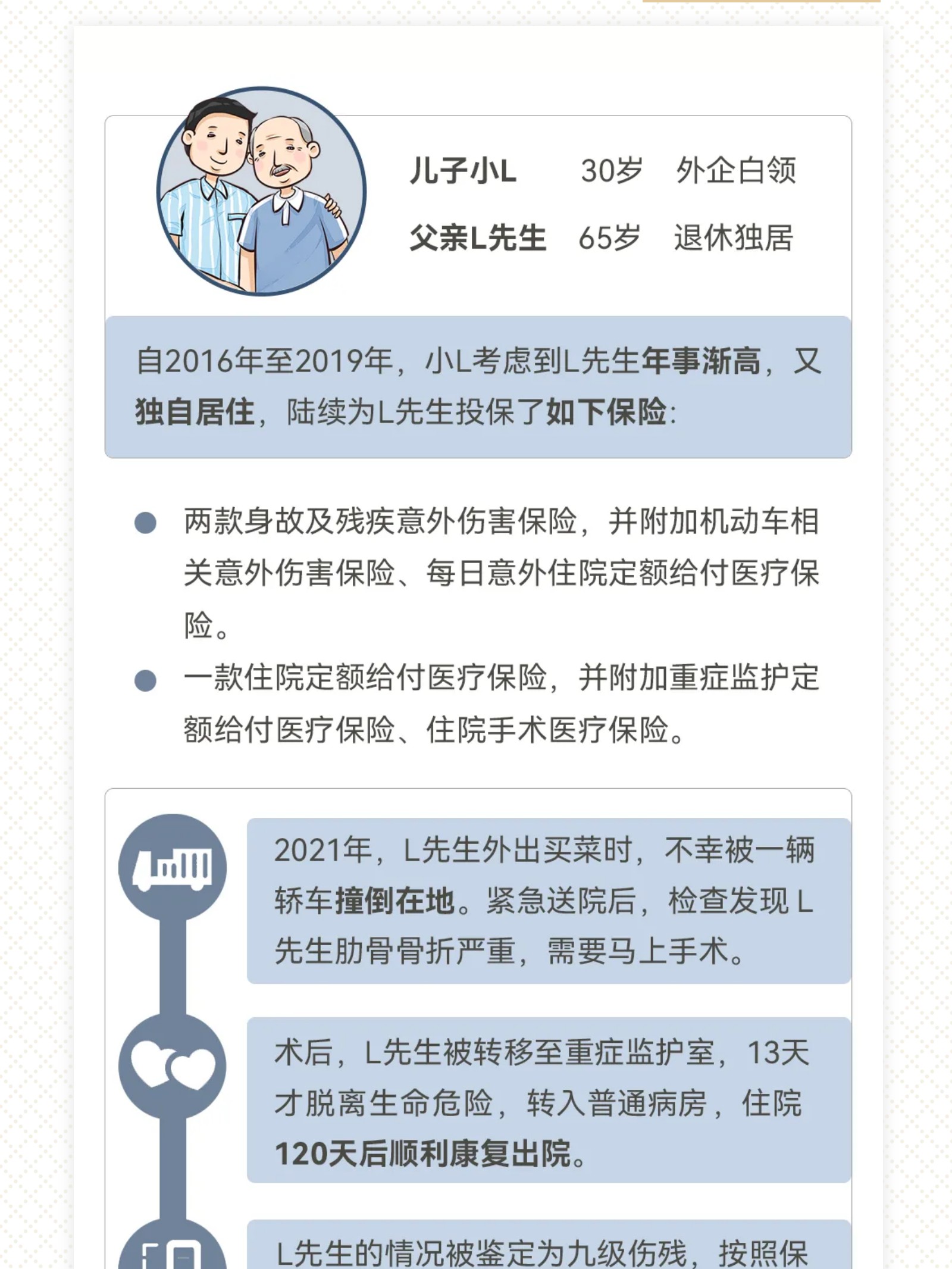 摘要:案例介绍:小L因工作无法照料自己的父亲,颇具风险意识的他为父亲配置了保险(意外险+医疗险),后因父亲出车祸获赔41.86万。随着我国空巢老人越来越多,作为子女要考虑为父母做保障。