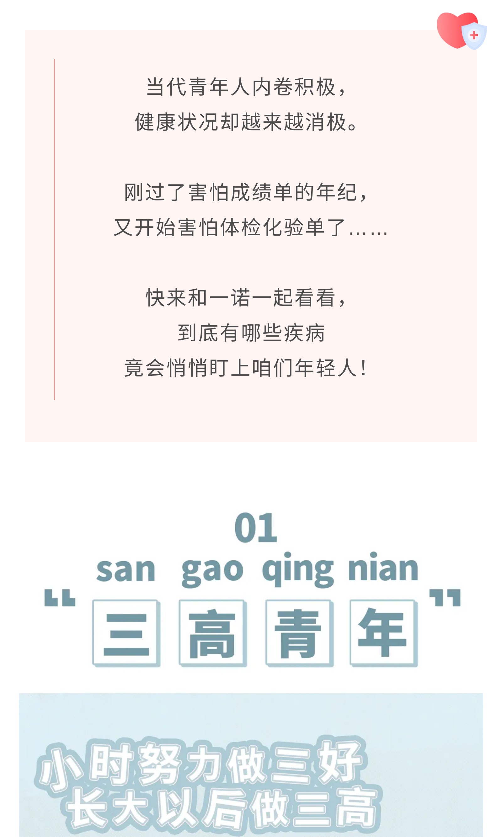 摘要:当代年轻人健康状况越来越消极,甚至于不敢去体检——三高、心悸、掉发......来看看到底有哪些疾病会悄悄盯上年轻人,以及这些疾病的对策和建议!