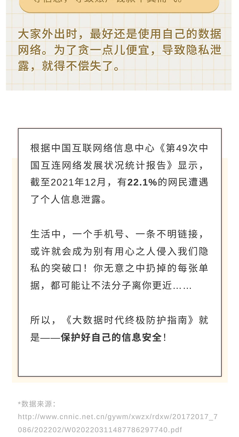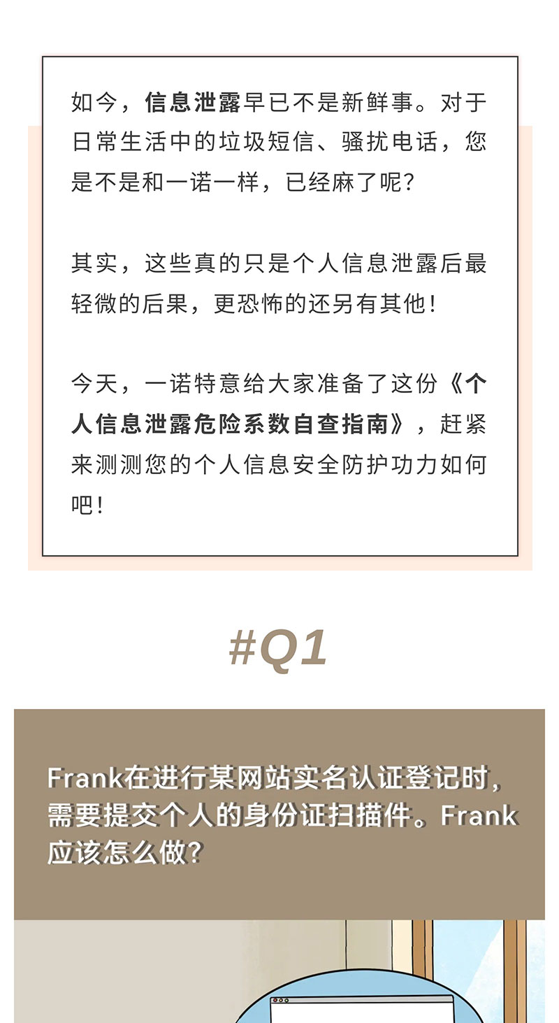 摘要:如今,信息泄露早已不是新鲜事。对于日常生活中的垃圾短信、骚扰电话,您是不是常常感到困扰?其实,这些真的只是个人信息泄露后最轻微的后果,更恐怖的还另有其他!这份《个人信息泄露危险系数自查指南》送给您,赶紧来测测您的个人信息安全防护功力如何吧!