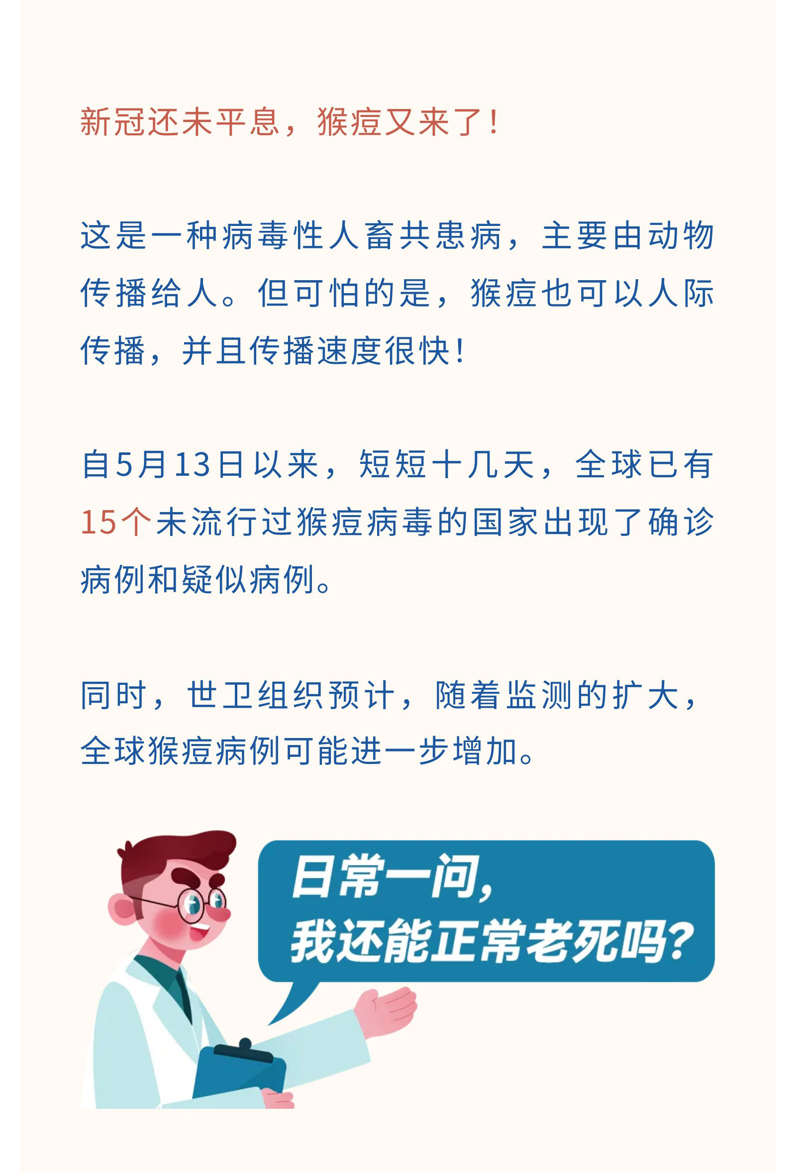 摘要:新冠还未平息,猴痘又来了!这是一种病毒性人畜共患病,主要由动物传播给人。但可怕的是,猴痘也可以人际传播,并且传播速度很快!下面这篇文章让您快速了解“猴痘”并且远离它。
