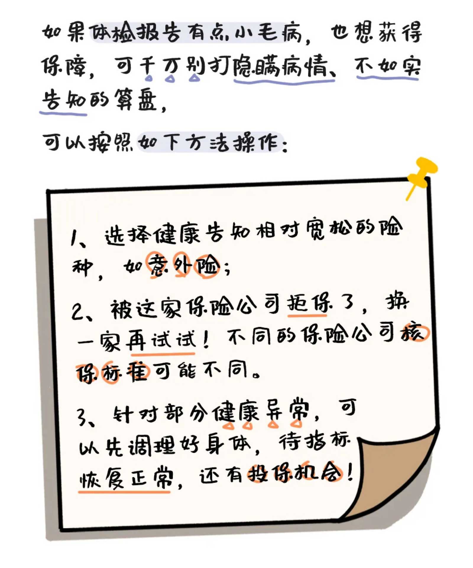 摘要:一面养生,一面作死,体检就像照妖镜,将我们日常积累的小病暴露无遗。怕体检,怕生病,于是干脆做个鸵鸟,买个保险一了百了。可是体检指标异常,投保真的会如想的这般简单吗?今天我们就来搞清楚~