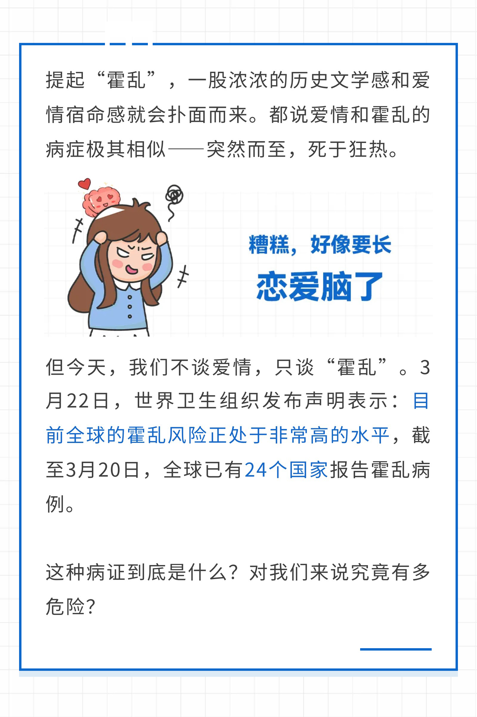 摘要:霍乱早在几世纪前,就祸祸过全人类,它是个高危传染病,在我国也被列为甲类传染病。日前,世界卫生组织发布声明表示:目前全球的霍乱风险正处于非常高的水平,已有多个国家报告有霍乱病例。霍乱到底是什么?对我们有什么影响,这篇文章告诉您~