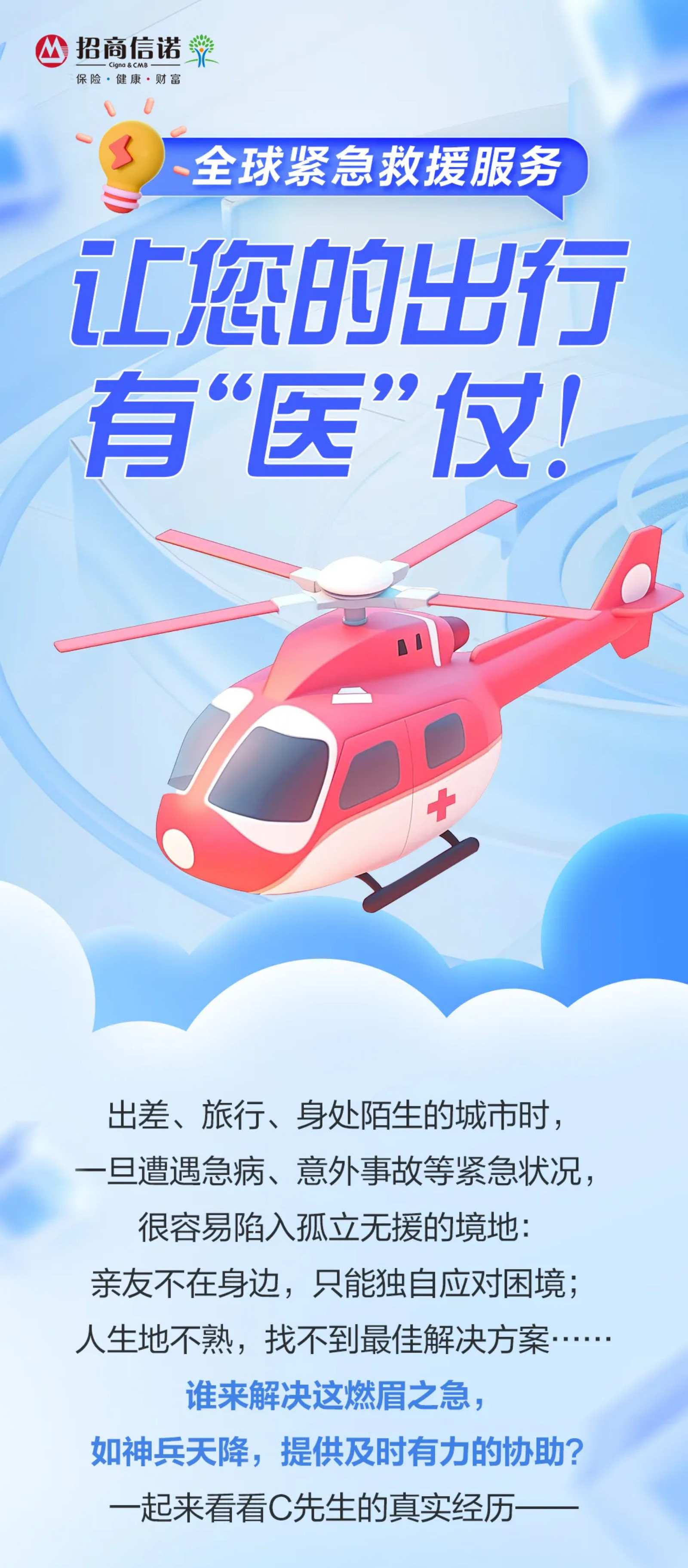 摘要:大家都不希望在出差时、旅行时、在陌生的城市,突发紧急事故,孤立无援,到时谁来解决这燃眉之急,谁会犹如神兵天降般提供及时有力的协助,招商信诺全球紧急救援服务助您一臂之力!