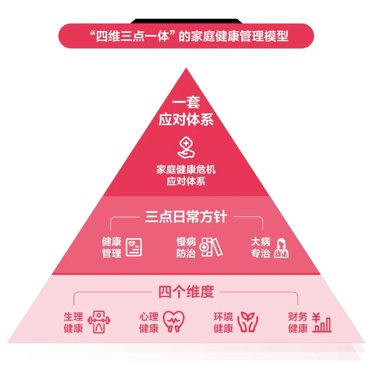 “四维三点一体”即“四个维度,三个日常方针,一套应对体系”。其中,“四个维度”指从生理健康、心理健康、环境健康和财务健康四个方面关注女性的健康问题;“三点日常方针”即女性为了守护个人和家庭的健康可以在日常中践行的准则,包括健康管理、慢病防治和大病专治;“一套应对体系”则是家庭健康危机应对体系,这套应对体系适用于所有家庭成员,涉及情感支持、症状识别、制定预防措施等一系列内容。
