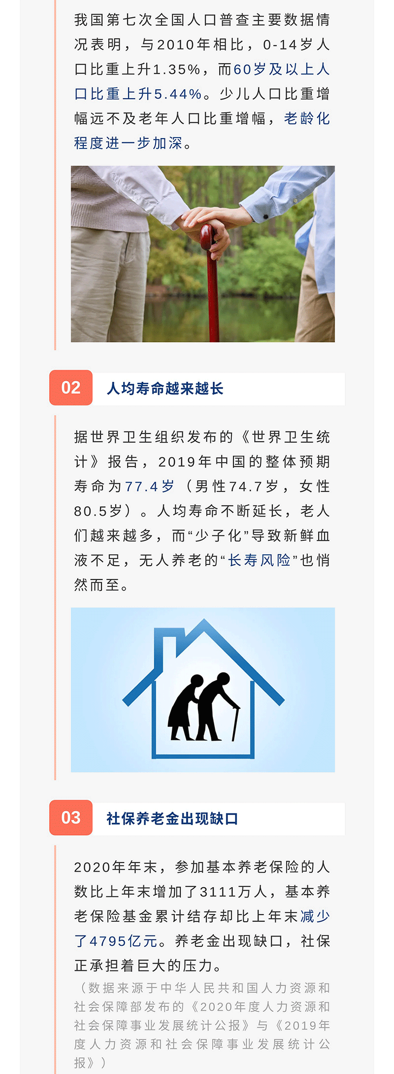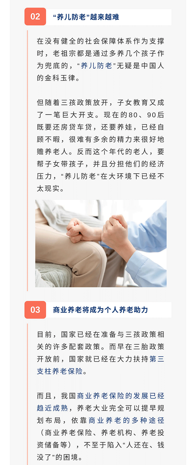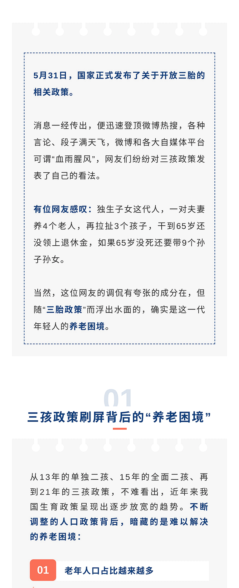 摘要:5月31日,国家正式发布了关于开放三胎的相关政策。有位网友感叹:独生子女这代人,一对夫妻养4个老人,再拉扯3个孩子,干到65岁还没领上退休金,如果65岁没死还要带9个孙子孙女。 当然,这位网友的调侃有夸张的成分在,但随“三胎政策”而浮出水面的,确实是这一代年轻人的养老困境。
