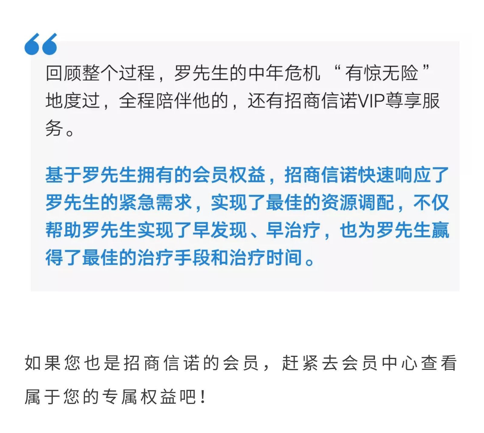 摘要:人们在描述中年这个群体时,总爱在后面加上危机二字。人到中年的高层管理人员罗先生,前段时间就真切体会到了这二字的涵义。他的“中年危机”,跟健康有关。他的危机解除,则与招商信诺为VIP客户提供的健康服务有关。