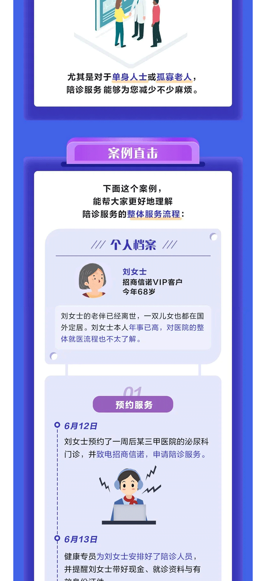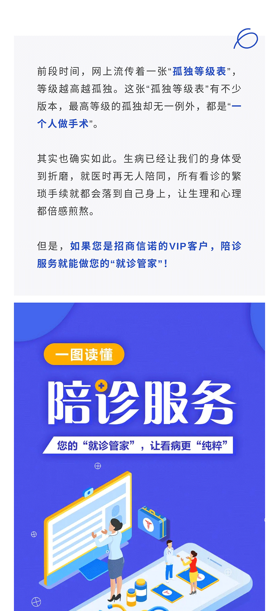 摘要:前段时间,网上流传着一张“孤独等级表”,等级越高越孤独。这张“孤独等级表”有不少版本,最高等级的孤独却无一例外,都是“一个人做手术”。其实也确实如此。生病已经让我们的身体受到折磨,就医时再无人陪同,所有看诊的繁琐手续就都会落到自己身上,让生理和心理都倍感煎熬。但是,如果您是招商信诺的VIP客户,陪诊服务就能做您的“就诊管家”!